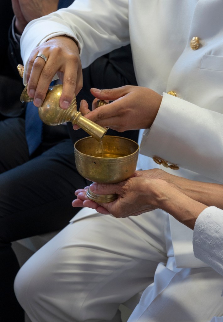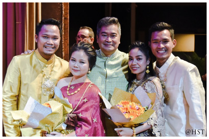 The tradition “Hold of Sbai” was first performed in 50 A.D, day of wedding between King Preah Thong and Queen Preah Neang Neak. In that wedding, King Preah Thong represented human kind, Queen Preah Neang Neak respresented the water world of the Naga, as she was the daughter of the Naga King. Preah Neang Neak’s Sbai is in fact the representation on earth of her Naga tail. On their honeymoon evening, Preah Thong had to hold his wife’s tail in order to cross the waters to join his father-in-law’s palace, under the sea. This is why, from that very moment on, all Cambodian weddings finish with this sight: an old lady of the family, happily married, leads by the hand the bride, with the groom holding the “sbai” of his wife.