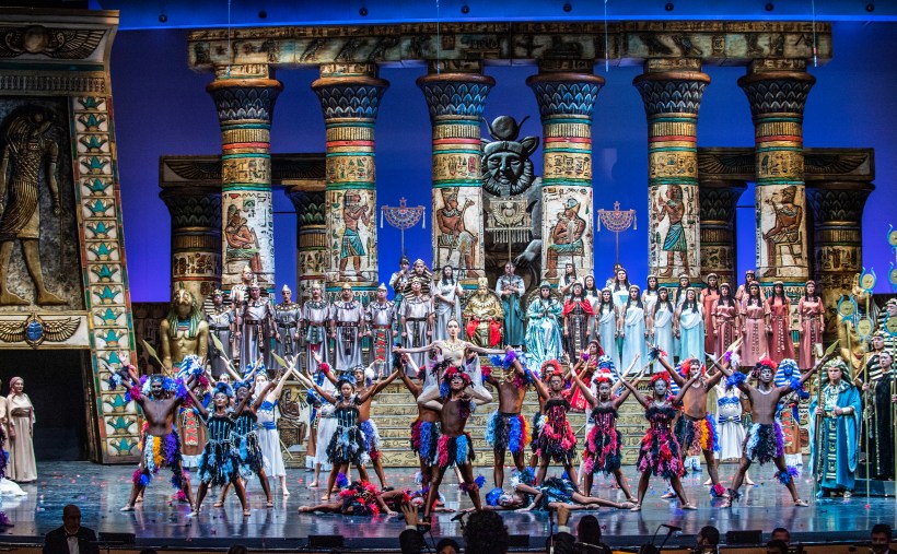 Ad un impianto che potremo definire classico, si sono volute far confluire molteplici esperienze, così come richiedeva un evento tanto significativo, in una città che storicamente è d’incontro tra culture. Il concetto: l’Egitto rivisitato a metà Ottocento dagli occhi dell’archeologo francese Auguste Mariette da cui il soggetto costitutivo di Aida e i disegni originali per scene e costumi; inoltre nell’impronta e quale omaggio alla lezione di Lila De Nobili (1916-2002), indimenticabile scenografo/pittore e costumista; una scenografia suntuosa realizzata da Özgür Usta che reinventa le strutture di una terra mitica qual è l’Egitto dei faraoni, filtrata e rivissuta attraverso la civiltà anatolica, ovvero con un’impronta tanto personale quanto propria di un territorio e della sua storia. Costumi dagli originali figurini di Savaş Camgöz, realizzati da Gürcan Kubilay. Il risultato è stato esaltante, con il coinvolgimento delle forze dei maggiori Opera e Balletto di Stato della Turchia: Solisti, Coro, Orchestra e Corpo di ballo, da Ankara, Antalya e dalla stessa Istanbul. Un impasto di colori e suggestioni, incorporati con luci sfavillanti, proiezioni e utilizzo d’immagini su fondale LED, nell’impegnativo compito di amalgamare tradizione a più moderne tecnologie. Un obbiettivo sostanzialmente raggiunto, perché ogni rappresentazione vive il suo momento e questa Aida era appositamente voluta per il nuovissimo Centro Culturale, subito dopo la prima mondiale di Sinan e nel ricco cartellone inaugurale a precedere il Concerto di Gala con gli artisti di canto più celebri della Turchia e al balletto La bella addormentata (in turco Uyuyan Guzel) di Cajkovskij ; così che tutte le arti del palcoscenico fossero presenti in questa solenne apertura dell’AKM di Istanbul. Per le proiezioni Ismail Tekin Demir, elaborazione LED di Burak Yıldırım. Le coreografie originali di Sergei Terechenko di significativa forza espressiva, realizzate con grande organico, riprese e attualizzate per l’occasione.