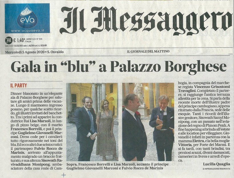Dopo il tradizionale brindisi di auguri e il tenero abbraccio dell’amica d’infanzia Vilma Zurzolo al nostro caro Fabio, il principe Guglielmo Giovanelli Marconi si recherà con altri invitati nel salotto della musica per proseguire la serata. Qui ci ritroveremo con tanti amici di sempre, la contessa Milena von Rex, il prefetto Fulvio Rocco de Marinis, la principessa Giorgia Pacelli, il marchese Gaetano Sersale, il N.H. Alessandro Solivetti e il suo gruppo di giovani amici dell’Ordine di Malta, che continueranno fino a tarda notte per celebrare con allegria e vivacità il ritorno della stagione estiva delle feste romane.