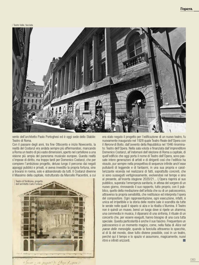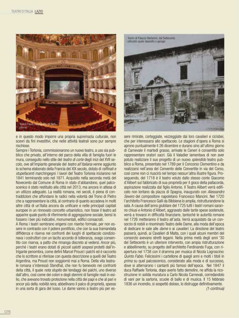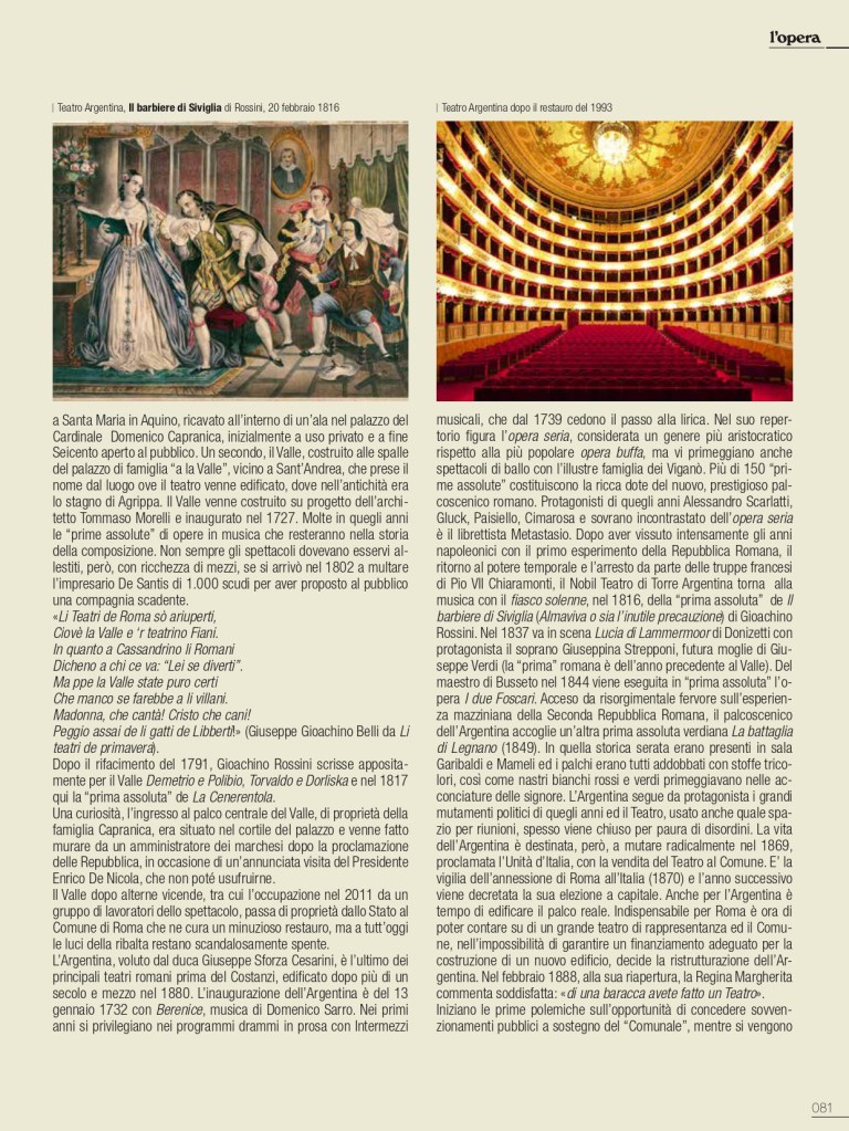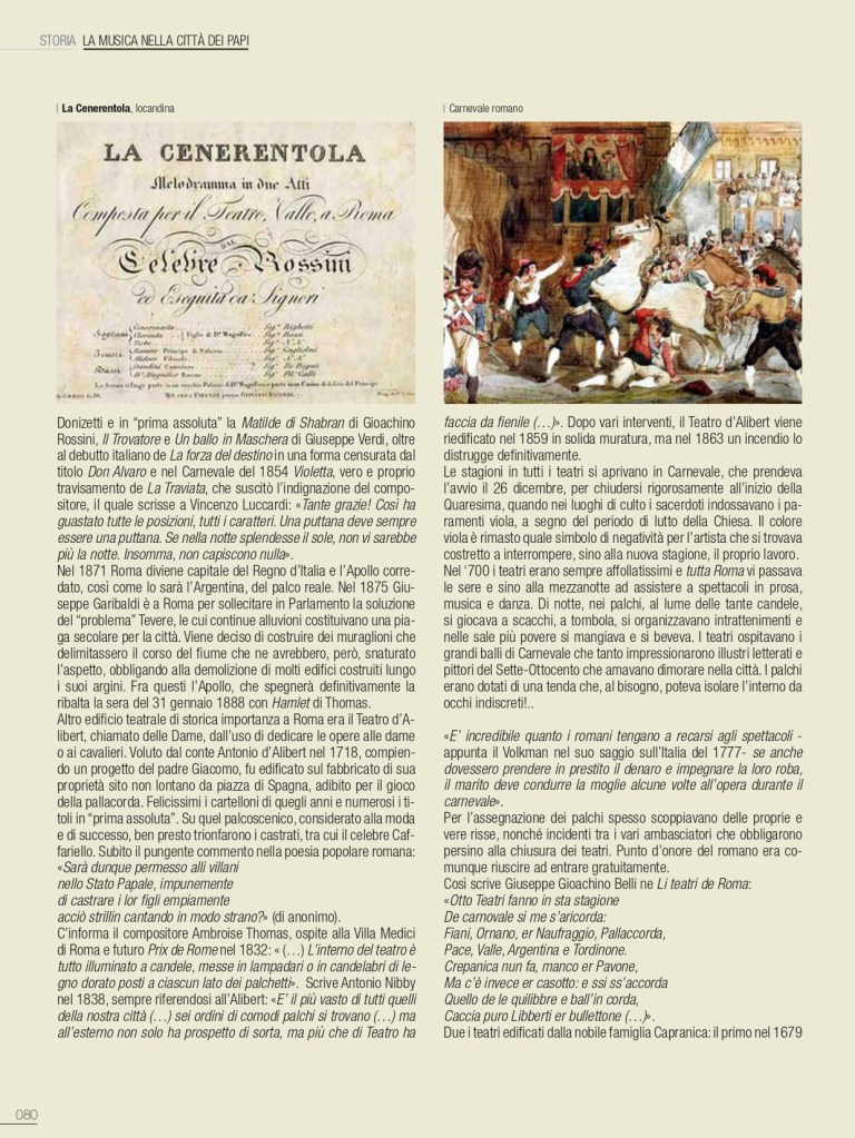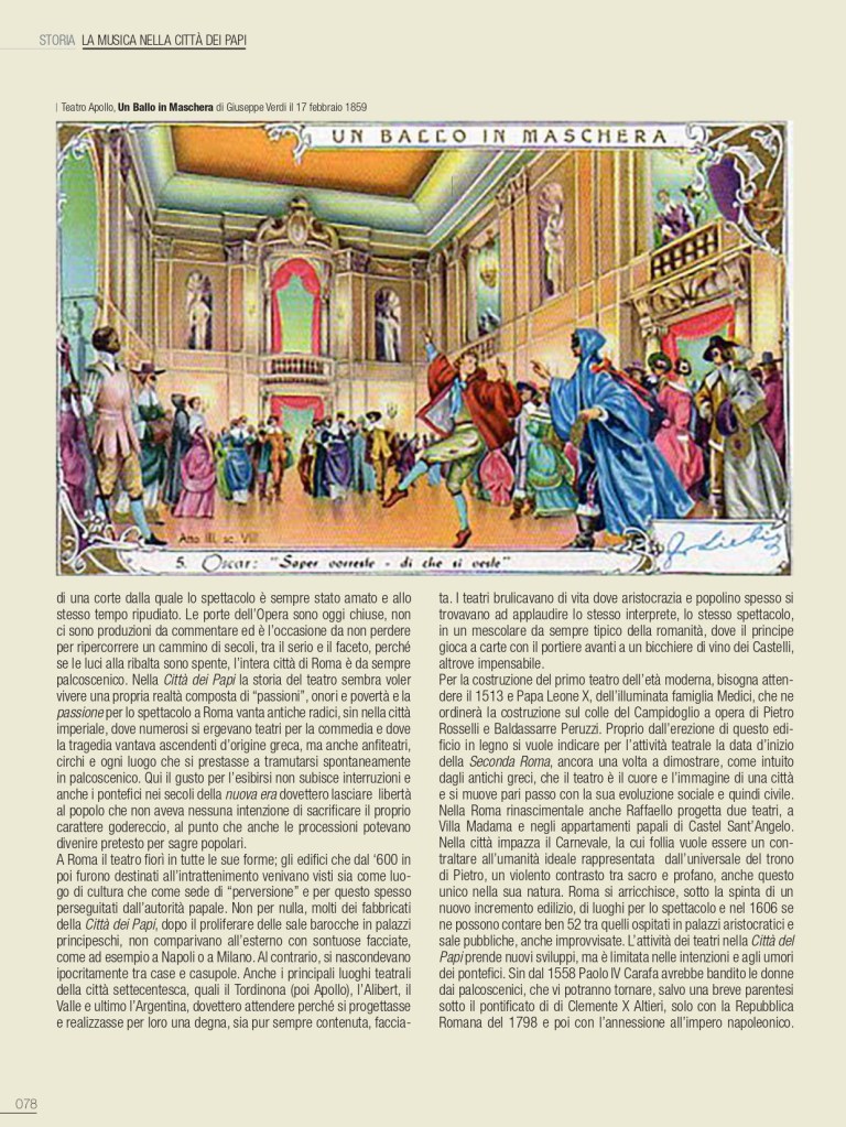 De I Teatri di Roma ci siamo già occupati nello scorso numero di gennaio, ma sarà egualmente interessante, in un cammino solo apparentemente similare, ripercorrerne i momenti salienti, con ulteriori, stimolanti annotazioni. Tra i teatri che hanno lasciato traccia nella storia di Roma, all’interno delle residenze della nobiltà nera, primeggia quello della famiglia di Papa Urbano VIII, al secolo Maffeo Barberini. Non era ancora agibile il loro sontuoso palazzo alle Quattro Fontane sul colle del Quirinale quando i Barberini, nella più contenuta residenza ai Giubbonari, inaugurarono la stagione operistica mettendo in scena l’8 marzo 1631 il Sant’Alessio, con musica di Stefano Landi, libretto di Giulio Rospigliosi, futuro Papa Clemente IX: «la rappresentatione di S. Alessio (…) tutta recitata in musica, sendo riuscita una delle più belle fattesi da un tempo in qua». L’apparato scenico è del ferrarese Francesco Guitti, costruttore delle macchine berniniane. Ancora il Sant’Alessio il 23 febbraio 1634 per l’inaugurazione del Teatro Barberini alle Quattro Fontane, in occasione dei festeggiamenti in onore di Alexander Charles Wasa principe di Polonia. Attiguo al nuovo palazzo dei Barberini, innalzato a gloria del casato, si presenta con sala rettangolare, ballatoio su tre lati, banchi in platea e palcoscenico incorniciato tra colonne; la facciata è progettata da Pietro da Cortona. Si disse che potesse ospitare fino a 1500 spettatori; snaturato sin dal Settecento, venne definitivamente demolito nel 1926 nel piano di ristrutturazione di Roma capitale del Regno d’Italia con l’apertura di via Regina Elena, poi via Barberini. Il Sant’Alessio riveste una particolare importanza nella storia del teatro in musica, perché non solo fu la prima opera composta su soggetto storico, ma nel descrivere minuziosamente la vita interiore del santo tentò una caratterizzazione psicologica di tipo nuovo nell’ambito del teatro d’opera. L’attività, le grandi feste che fecero capo a questo spazio teatrale dei Barberini restano nella storia per la loro sontuosa creatività. Con Urbano VIII si concludeva di fatto la Controriforma e il pontefice prediligerà l’insorgente Barocco quale stile della Chiesa trionfante. Nei poco più di quarant’anni di regno di papa Barberini, l’Urbe diventerà una città ancora più imparagonabile, anche grazie alla creatività di artisti quali Gian Lorenzo Bernini, che si può indicare quale il massimo regista del Barocco romano. Per la corte papale il Bernini si dedicò a predisporre spettacoli in Vaticano e per il teatro di famiglia del pontefice si prodigò quale impareggiabile scenografo, regista ed attore. Bernini volle, inoltre, edificare nella sua casa di via del Corso uno spazio per spettacoli, il Teatro Bernini, oggi scomparso. Un versante quasi inesplorato del Seicento romano è quello dedicato a studi più approfonditi sul mecenatismo musicale della grandi famiglie della nobiltà nera e dei Principi della Chiesa.