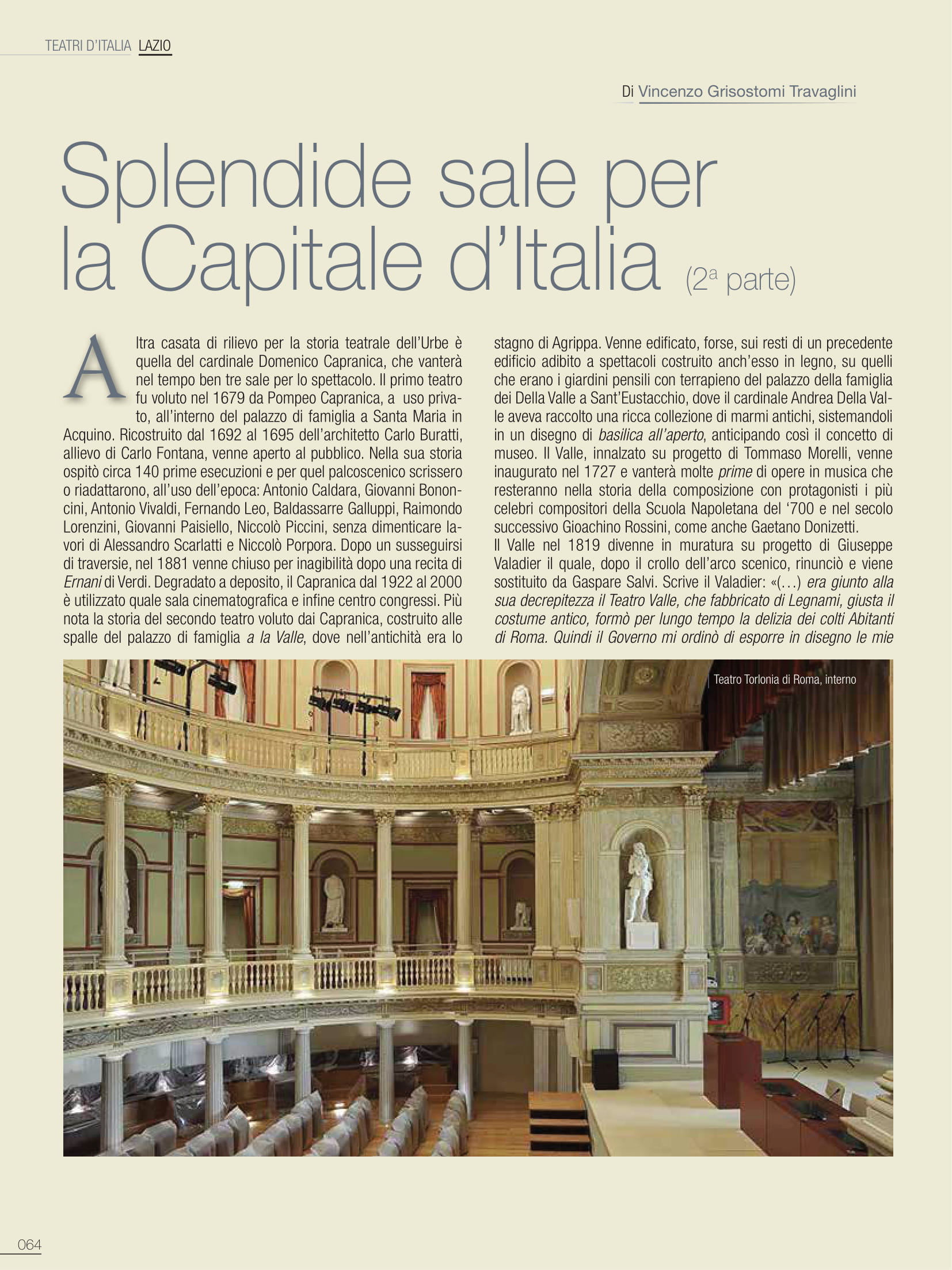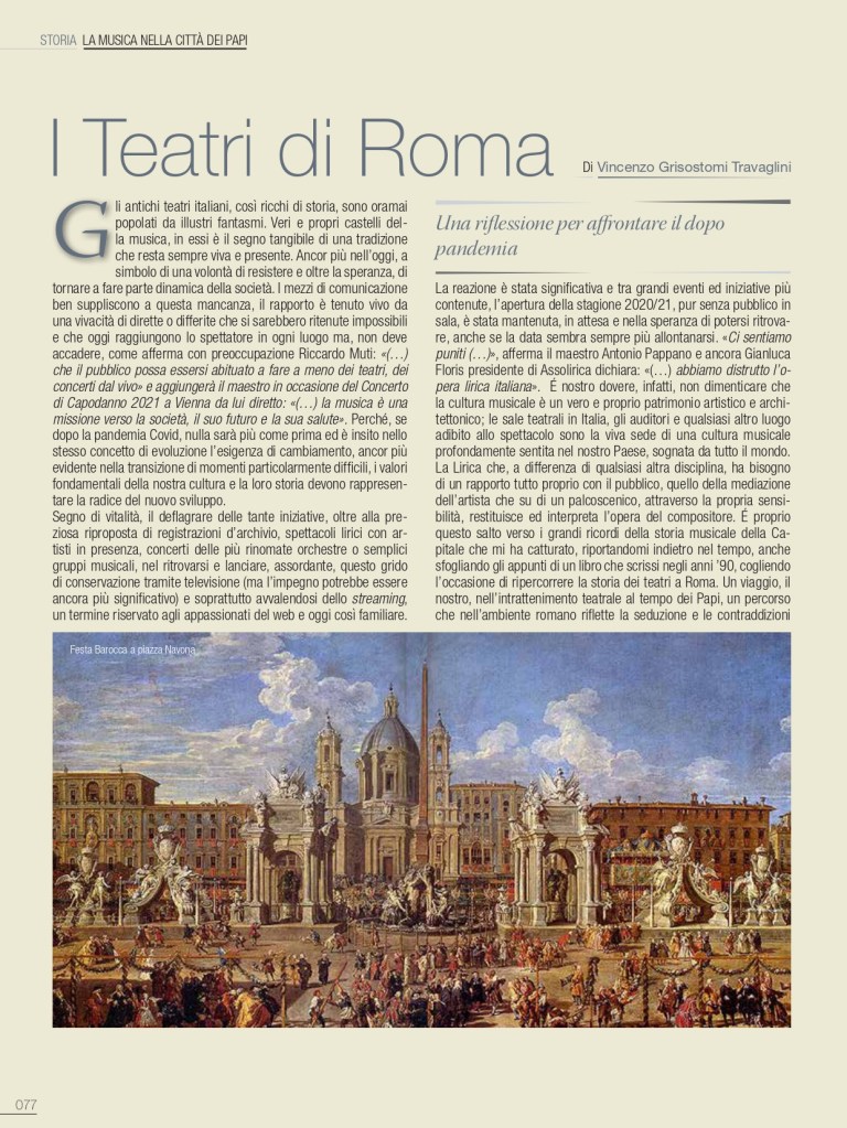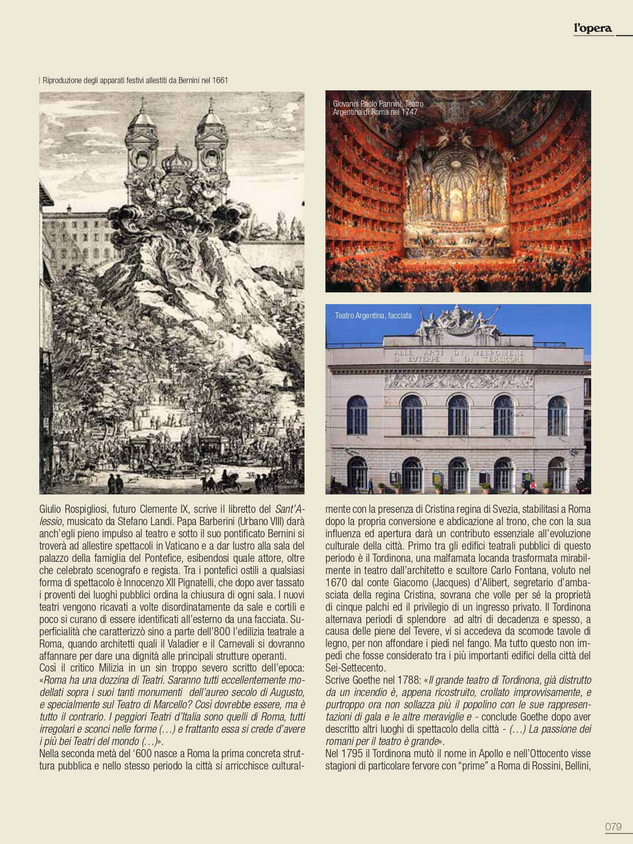 De I Teatri di Roma ci siamo già occupati nello scorso numero di gennaio, ma sarà egualmente interessante, in un cammino solo apparentemente similare, ripercorrerne i momenti salienti, con ulteriori, stimolanti annotazioni. Tra i teatri che hanno lasciato traccia nella storia di Roma, all’interno delle residenze della nobiltà nera, primeggia quello della famiglia di Papa Urbano VIII, al secolo Maffeo Barberini. Non era ancora agibile il loro sontuoso palazzo alle Quattro Fontane sul colle del Quirinale quando i Barberini, nella più contenuta residenza ai Giubbonari, inaugurarono la stagione operistica mettendo in scena l’8 marzo 1631 il Sant’Alessio, con musica di Stefano Landi, libretto di Giulio Rospigliosi, futuro Papa Clemente IX: «la rappresentatione di S. Alessio (…) tutta recitata in musica, sendo riuscita una delle più belle fattesi da un tempo in qua». L’apparato scenico è del ferrarese Francesco Guitti, costruttore delle macchine berniniane. Ancora il Sant’Alessio il 23 febbraio 1634 per l’inaugurazione del Teatro Barberini alle Quattro Fontane, in occasione dei festeggiamenti in onore di Alexander Charles Wasa principe di Polonia. Attiguo al nuovo palazzo dei Barberini, innalzato a gloria del casato, si presenta con sala rettangolare, ballatoio su tre lati, banchi in platea e palcoscenico incorniciato tra colonne; la facciata è progettata da Pietro da Cortona. Si disse che potesse ospitare fino a 1500 spettatori; snaturato sin dal Settecento, venne definitivamente demolito nel 1926 nel piano di ristrutturazione di Roma capitale del Regno d’Italia con l’apertura di via Regina Elena, poi via Barberini. Il Sant’Alessio riveste una particolare importanza nella storia del teatro in musica, perché non solo fu la prima opera composta su soggetto storico, ma nel descrivere minuziosamente la vita interiore del santo tentò una caratterizzazione psicologica di tipo nuovo nell’ambito del teatro d’opera. L’attività, le grandi feste che fecero capo a questo spazio teatrale dei Barberini restano nella storia per la loro sontuosa creatività. Con Urbano VIII si concludeva di fatto la Controriforma e il pontefice prediligerà l’insorgente Barocco quale stile della Chiesa trionfante. Nei poco più di quarant’anni di regno di papa Barberini, l’Urbe diventerà una città ancora più imparagonabile, anche grazie alla creatività di artisti quali Gian Lorenzo Bernini, che si può indicare quale il massimo regista del Barocco romano. Per la corte papale il Bernini si dedicò a predisporre spettacoli in Vaticano e per il teatro di famiglia del pontefice si prodigò quale impareggiabile scenografo, regista ed attore. Bernini volle, inoltre, edificare nella sua casa di via del Corso uno spazio per spettacoli, il Teatro Bernini, oggi scomparso. Un versante quasi inesplorato del Seicento romano è quello dedicato a studi più approfonditi sul mecenatismo musicale della grandi famiglie della nobiltà nera e dei Principi della Chiesa.