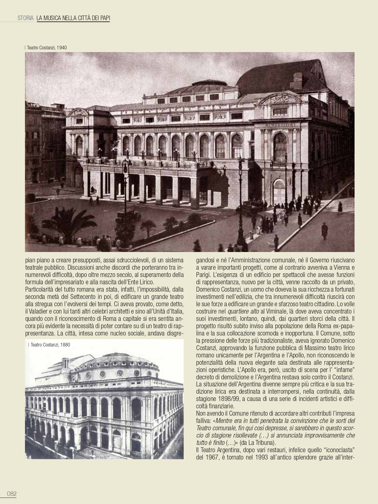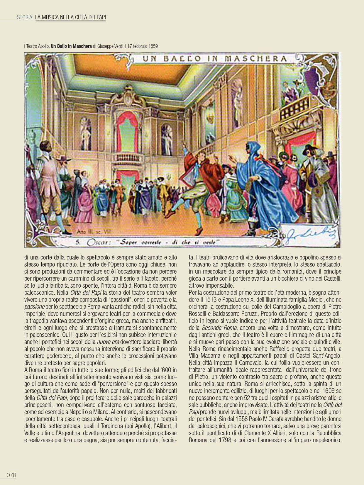 Siamo in pieno Rinascimento; di soli due giorni nel 1513 è la vita del primo edificio che segna l’attività teatrale della Seconda Roma. Interamente realizzato in legno venne eretto sul colle del Campidoglio su progetto dell’architetto Pietro Rosselli, per una capienza, si dice, di tremila posti con apparato scenografico di Baldassarre Peruzzi. Fu voluto da Papa Leone X della famiglia Medici, in occasione dei festeggiamenti per il conferimento della cittadinanza romana a suo fratello: Giuliano de’ Medici duca di Nemours. Circa del 1561 è il Teatro Anguillara, che si tramanda sia stato costruito dal poeta Giovanni Andrea Anguillara, appartenente a una delle famiglie più antiche di Roma, ricavato all’interno del suo palazzo in piazza Santi Apostoli. Con tutta probabilità già teatro pubblico fu quello edificato in via Giulia, attivo circa dal 1560 al 1575. A Roma il piacere per lo spettacolo attraversa i secoli: le corse dei cavalli e le naumachie a piazza Navona, cui seguiranno spettacoli di divertimento in musica con testi di Plauto e di Macchiavelli, a cui nel Rinascimento collaborerà quale scenografo anche Raffaello e nel Barocco Gian Lorenzo Bernini. A Raffaello Sanzio era stato commissionato da Leone X il progetto di una villa suburbana su terreno di proprietà della famiglia Medici, che in seguito prenderà il nome di Villa Madama, includente un teatro, come annota lo stesso pittore e architetto in una dettagliata descrizione a Baldassarre Castiglione: «In questo spatio vi è un bello theatro fatto con questa misura et ragione (…) ce sono fatte le gradinate, la scena, il pulpito et l’horchestra (…) E questo theatro è collocato in modo che non può havere sole doppo il mezzodí, la quale è hora solita a simili giochi». A questi divertimenti in musica, in austero clima di Controriforma, s’ispireranno le altrimenti moraleggianti sacre rappresentazioni, da cui nel febbraio 1600 scaturirà il dramma sacro La rappresentazione di anima et di corpo con libretto di Agostino Manni e musica di Emilio de’ Cavalieri, eseguita all’Oratorio della Vallicella; una vera e propria opera rappresentata con scene, costumi e ricca di balli. Potrebbe sembrare una contraddizione, ma a Roma neanche i pontefici e le severe proibizioni poterono mutare nello scorrere degli eventi la vocazione di un popolo gaudente, che tendeva a trasformare in ricorrenza ogni tipo di evento, per cui anche le processioni erano giustificazione per giochi e sagre. In questi divertimenti primeggiava il Carnevale, la cui origine risale agli antichi Saturnali, tradizione che si protrarrà a simbolo della festosità del carattere dei romani, che in essi convive con la tristezza della rassegnazione e la saggia indolenza. Una tradizione che più di altre resisterà all’usura dei secoli e sino alla seconda metà del XX secolo, quando i bagliori di una città ormai snaturata da qualsiasi radice storico-culturale e troppo frettolosamente trasformata in capitale, verranno spenti dal dilagante borghesismo, soffocati anche negli aspetti più radicati.