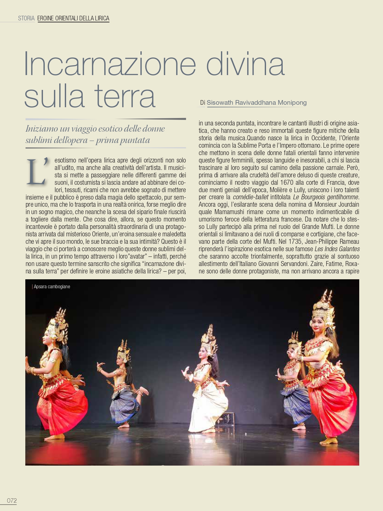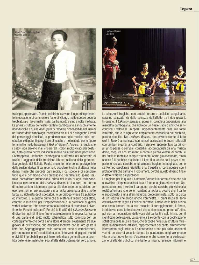 “Au théâtre Koh Pich de Phnom Penh, les danseuses du Ballet Royal du Cambodge ont fait parties du prestigieux casting de Madama Butterfly, d’après l’oeuvre de Puccini. Le prince Ravivaddhana Sisowath, co-metteur en scène de la pièce avec le marquis Vincenzo Grisostomi Travaglini, a souhaité ainsi rendre hommage à son pays et à l’opéra, sa passion depuis toujours.”