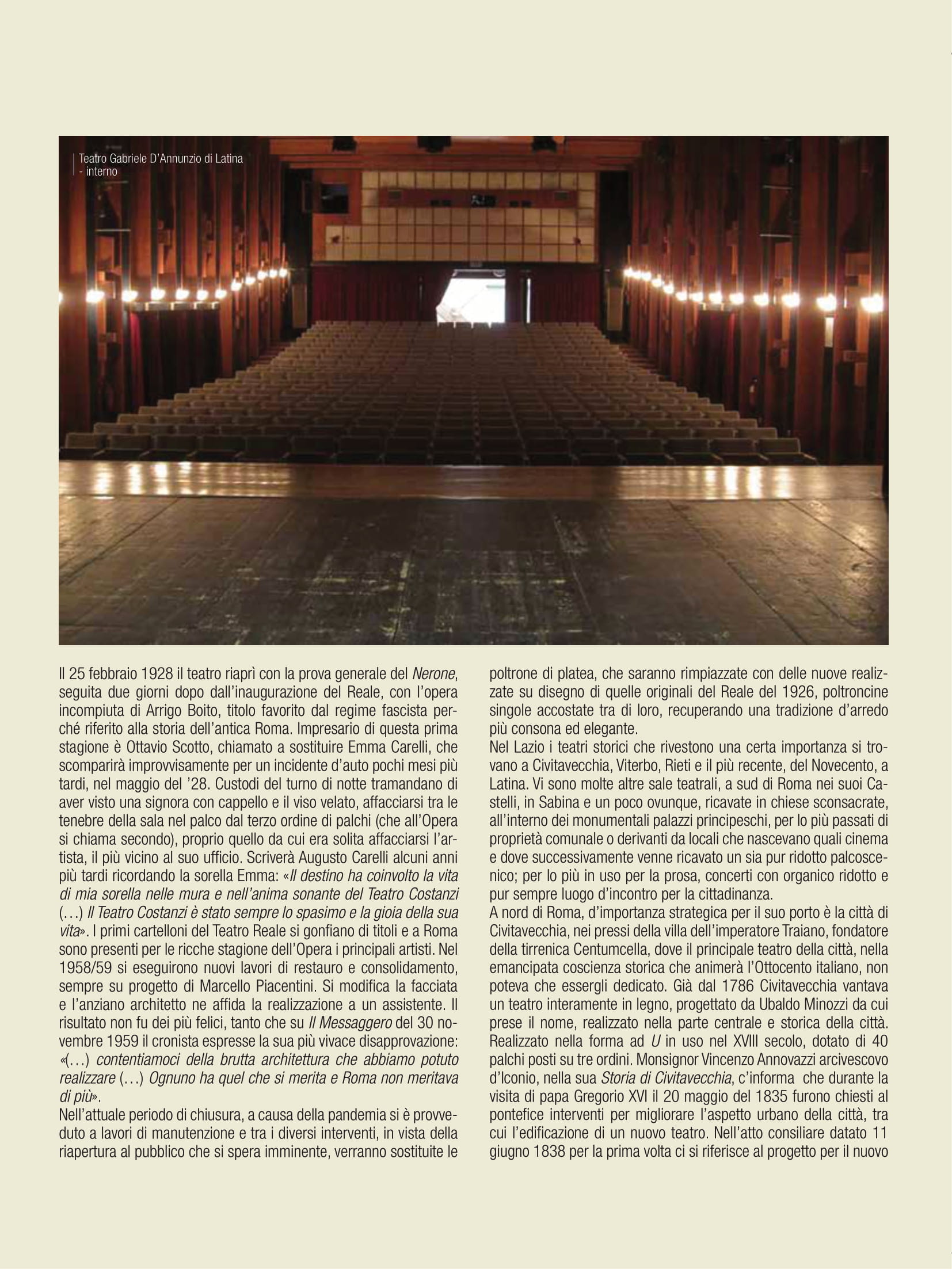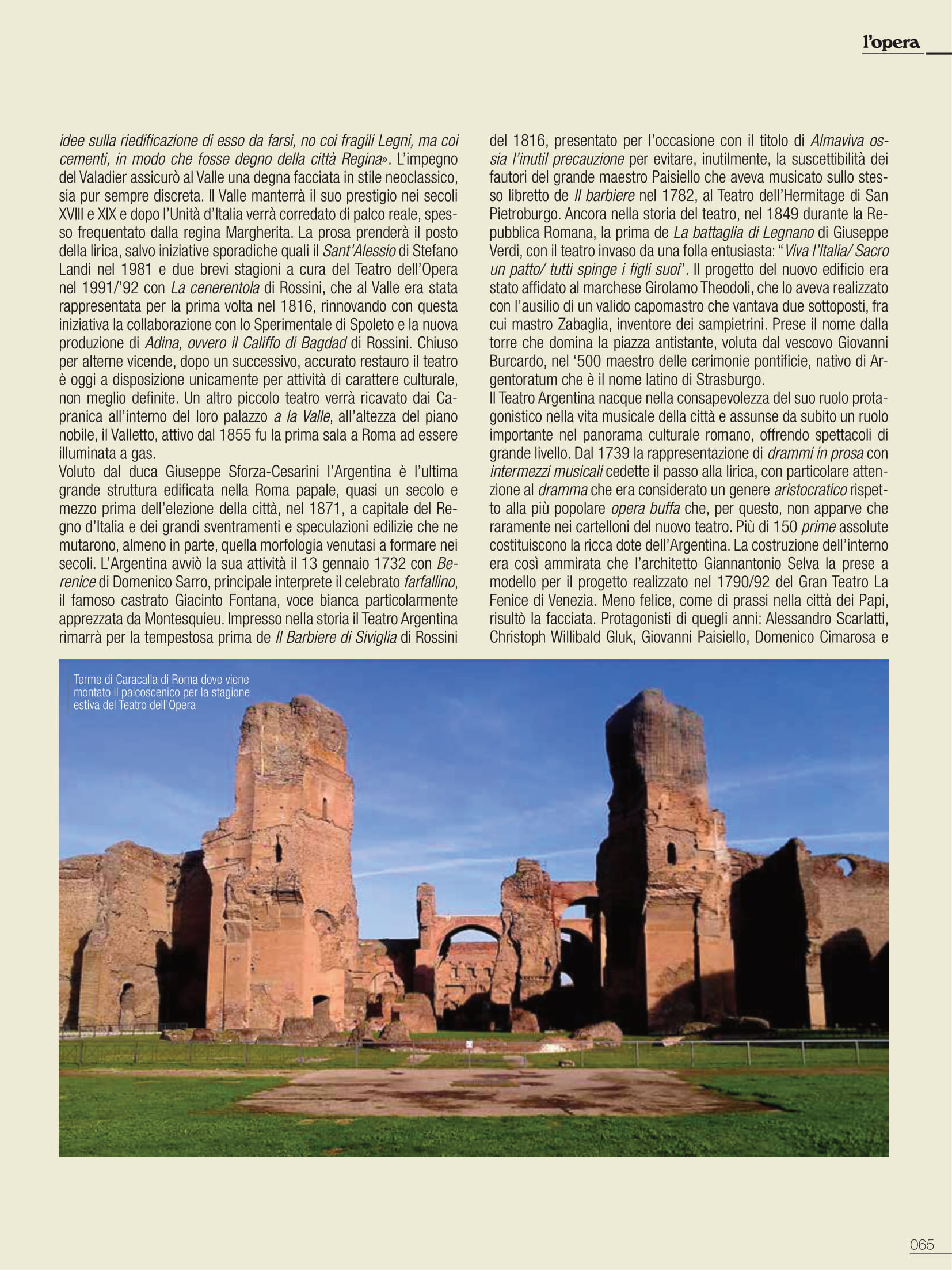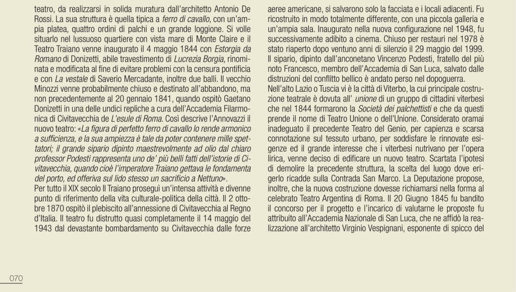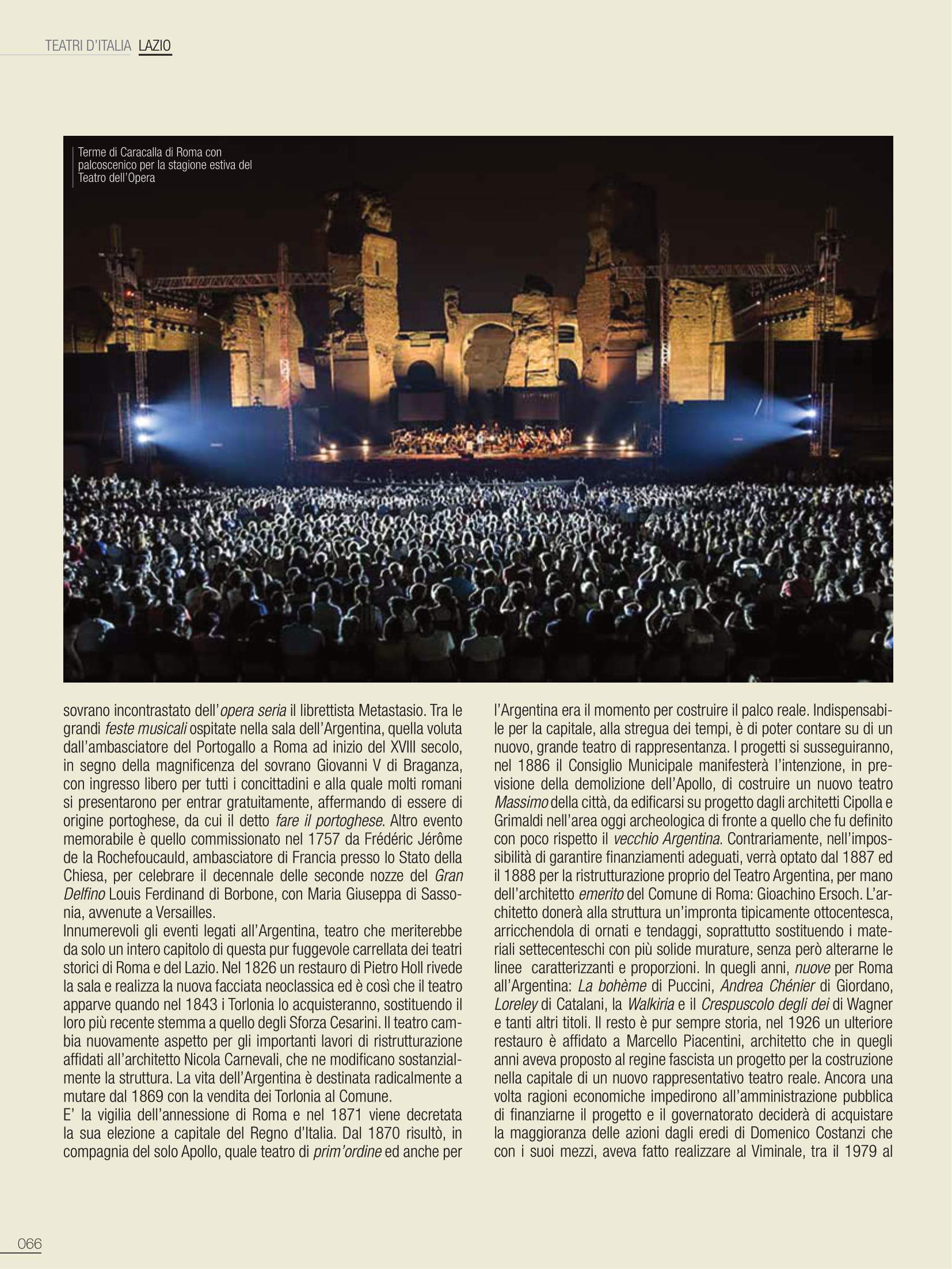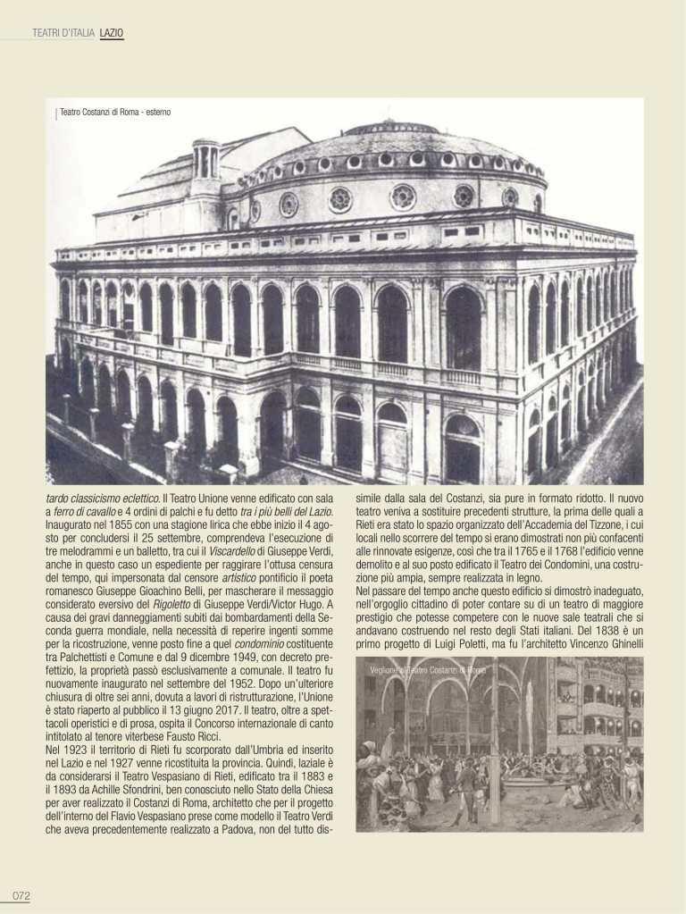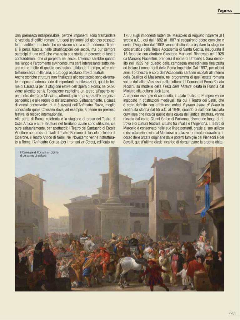 Una premessa indispensabile, perché imponenti sono tramandate le vestigia di edifici romani, tutt’oggi testimoni del glorioso passato; teatri, anfiteatri e circhi che convivono con la città moderna. Di altri si è persa traccia, nelle stratificazioni dei secoli, ma pur sempre partecipi di una città che vive nella sua storia un percorso di fasti e contraddizioni, che si perpetra nei secoli. L’elenco sarebbe quanto mai lungo e l’argomento avvincente, ma sarà interessante sottolineare come molte di queste costruzioni, sfidando il tempo, oltre che testimonianza millenaria, a tutt’oggi ospitano attività teatrali. Anche storiche strutture non finalizzate allo spettacolo sono diventate in epoca moderna sede di importanti manifestazioni, quali le Terme di Caracalla per la stagione estiva dell’Opera di Roma; nel 2020 viene allestito per la Fondazione capitolina un teatro all’aperto nel perimetro del Circo Massimo, offrendo più ampi spazi all’emergenza pandemica e alle regole di distanziamento. Saltuariamente, a causa di vincoli conservativi, ci si è avvalsi dell’Anfiteatro Flavio, meglio conosciuto quale Colosseo dove, ad esempio, si tenne un prezioso festival di respiro internazionale. Alle porte di Roma, celebrata è la stagione di prosa del Teatro di Ostia Antica e altre strutture nel territorio laziale sono utilizzate, sia pure saltuariamente, per spettacoli: il Teatro del Santuario di Ercole Vincitore nei pressi di Tivoli, il Teatro Romano di Tuscolo o Teatro di Cicerone, il Teatro Antico di Nemi.
