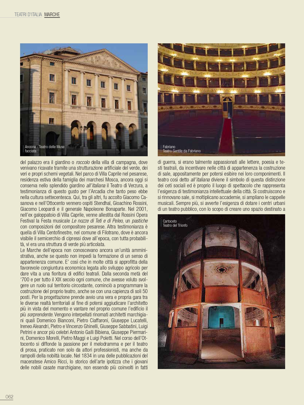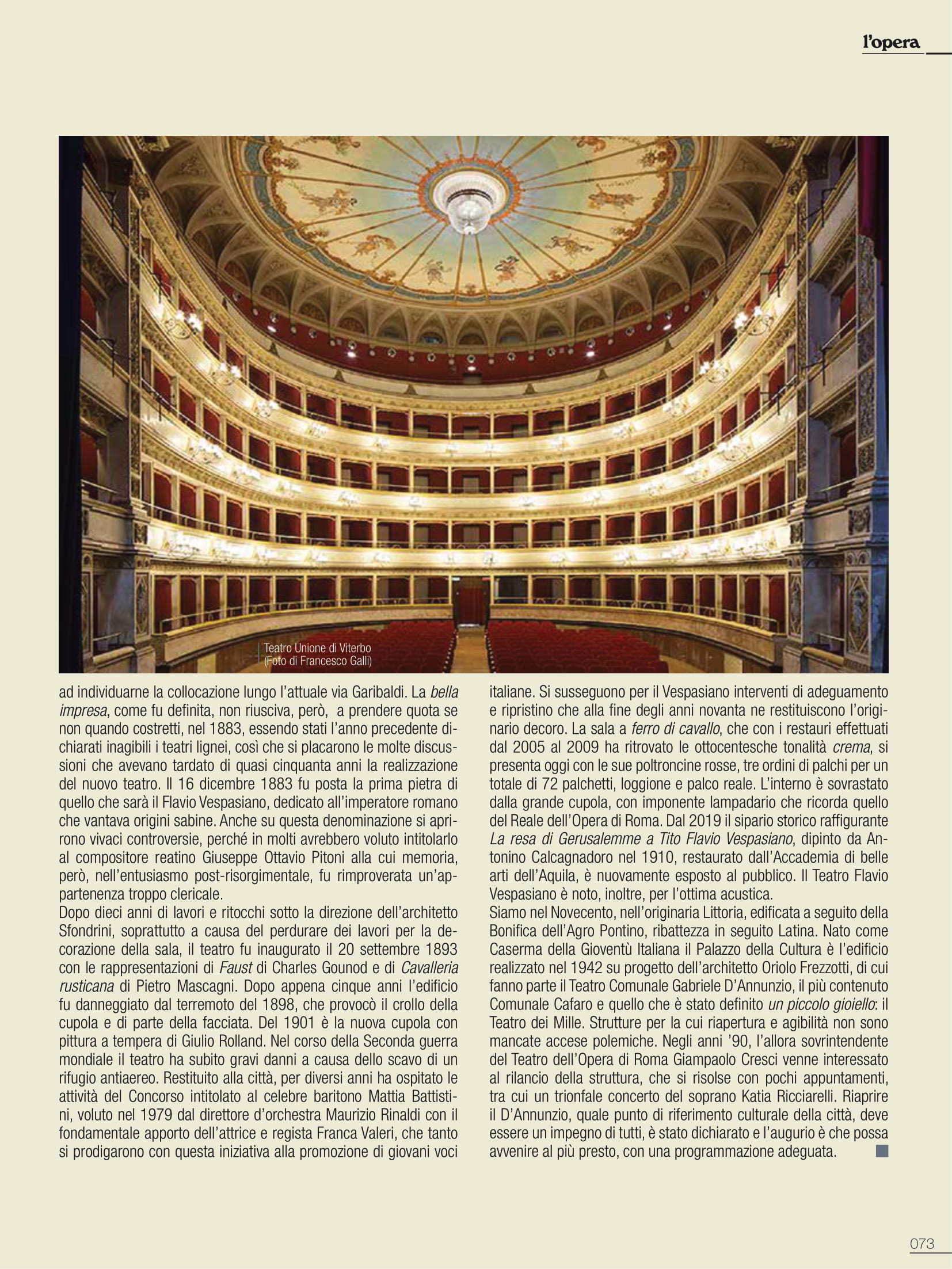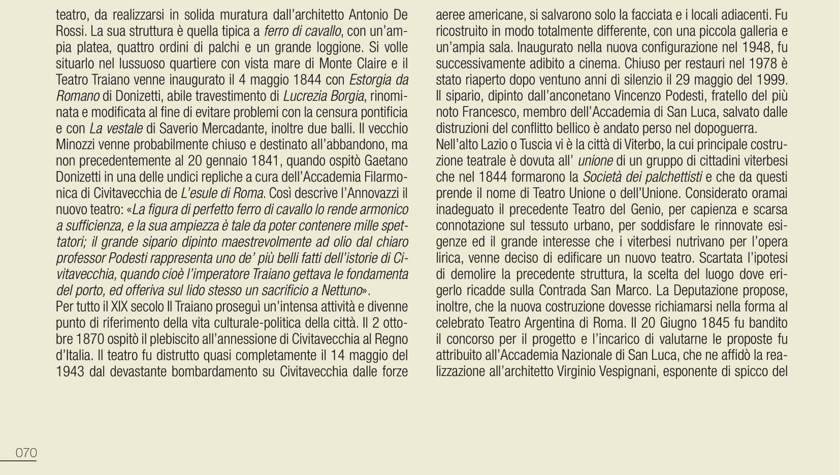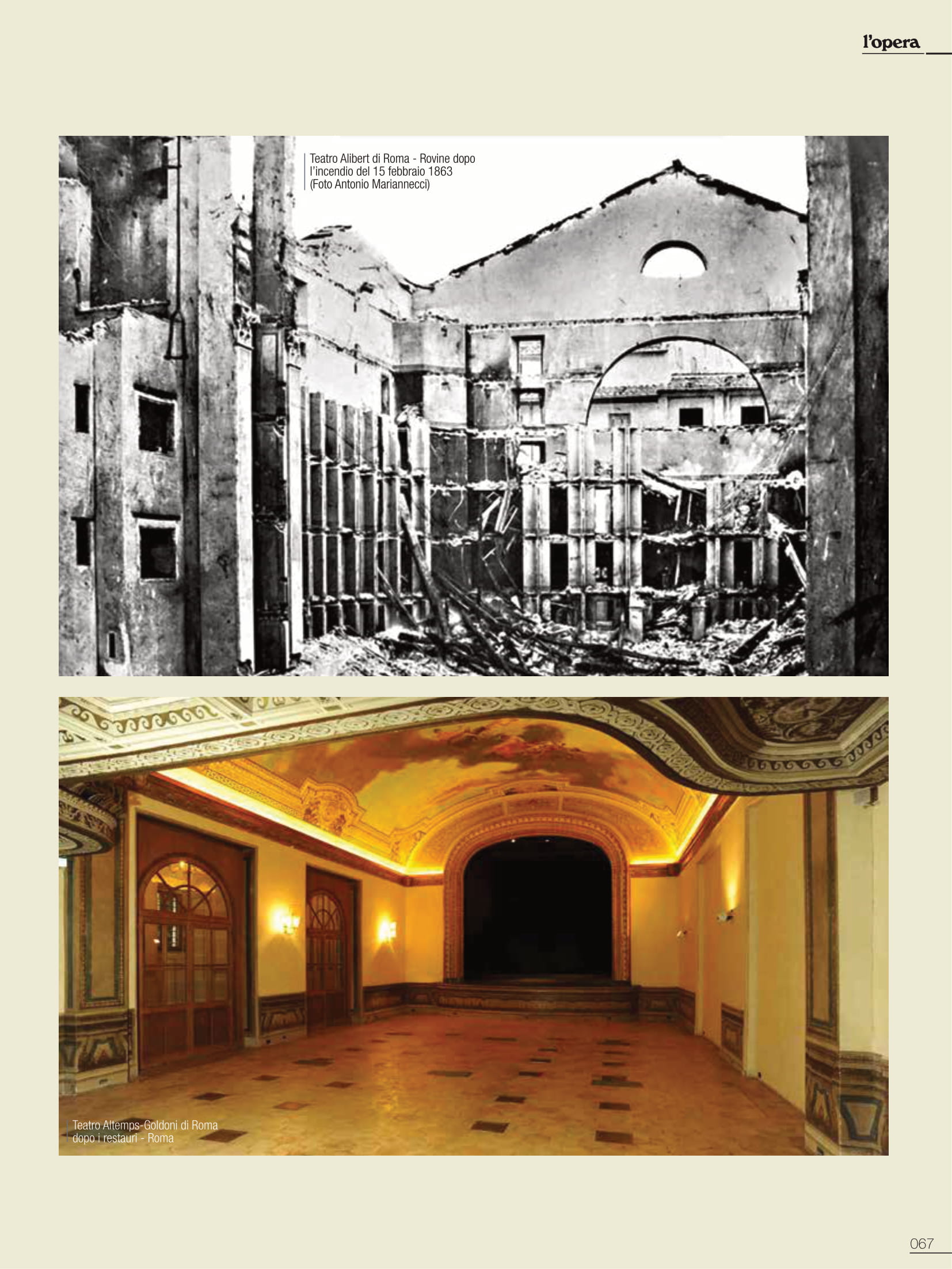 Una premessa indispensabile, perché imponenti sono tramandate le vestigia di edifici romani, tutt’oggi testimoni del glorioso passato; teatri, anfiteatri e circhi che convivono con la città moderna. Di altri si è persa traccia, nelle stratificazioni dei secoli, ma pur sempre partecipi di una città che vive nella sua storia un percorso di fasti e contraddizioni, che si perpetra nei secoli. L’elenco sarebbe quanto mai lungo e l’argomento avvincente, ma sarà interessante sottolineare come molte di queste costruzioni, sfidando il tempo, oltre che testimonianza millenaria, a tutt’oggi ospitano attività teatrali. Anche storiche strutture non finalizzate allo spettacolo sono diventate in epoca moderna sede di importanti manifestazioni, quali le Terme di Caracalla per la stagione estiva dell’Opera di Roma; nel 2020 viene allestito per la Fondazione capitolina un teatro all’aperto nel perimetro del Circo Massimo, offrendo più ampi spazi all’emergenza pandemica e alle regole di distanziamento. Saltuariamente, a causa di vincoli conservativi, ci si è avvalsi dell’Anfiteatro Flavio, meglio conosciuto quale Colosseo dove, ad esempio, si tenne un prezioso festival di respiro internazionale. Alle porte di Roma, celebrata è la stagione di prosa del Teatro di Ostia Antica e altre strutture nel territorio laziale sono utilizzate, sia pure saltuariamente, per spettacoli: il Teatro del Santuario di Ercole Vincitore nei pressi di Tivoli, il Teatro Romano di Tuscolo o Teatro di Cicerone, il Teatro Antico di Nemi.