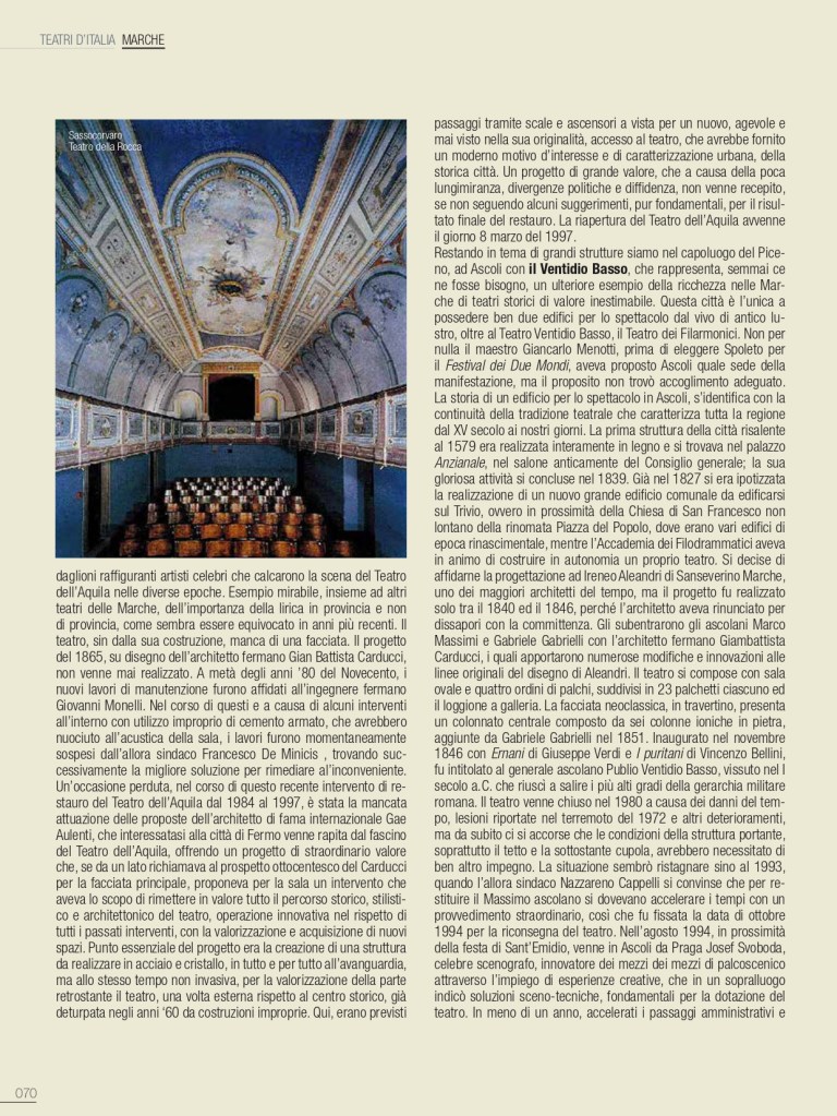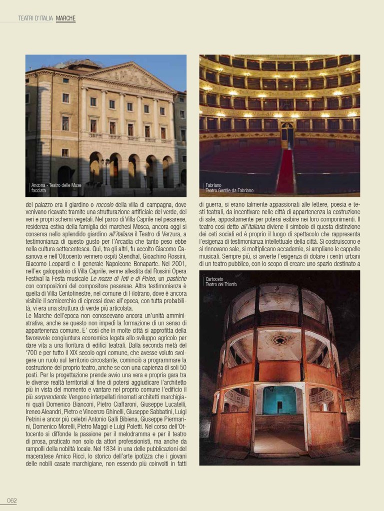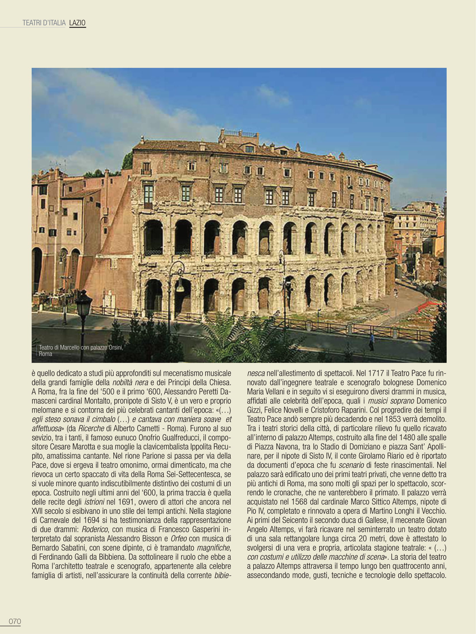 A Roma, fra la fine del ‘500 e il primo ‘600, Alessandro Peretti Damasceni cardinal Montalto, pronipote di Sisto V, è un vero e proprio melomane e si contorna dei più celebrati cantanti dell’epoca: «(…) egli steso sonava il cimbalo (…) e cantava con maniera soave et affettuosa» (da Ricerche di Alberto Cametti – Roma). Furono al suo sevizio, tra i tanti, il famoso eunuco Onofrio Gualfreducci, il compositore Cesare Marotta e sua moglie la clavicembalista Ippolita Recupito, amatissima cantante. Nel rione Parione si passa per via della Pace, dove si ergeva il teatro omonimo, ormai dimenticato, ma che rievoca un certo spaccato di vita della Roma Sei-Settecentesca, se si vuole minore quanto indiscutibilmente distintivo dei costumi di un epoca. Costruito negli ultimi anni del ‘600, la prima traccia è quella delle recite degli istrioni nel 1691, ovvero di attori che ancora nel XVII secolo si esibivano in uno stile dei tempi antichi. Nella stagione di Carnevale del 1694 si ha testimonianza della rappresentazione di due drammi: Roderico, con musica di Francesco Gasperini interpretato dal sopranista Alessandro Bisson e Orfeo con musica di Bernardo Sabatini, con scene dipinte, ci è tramandato magnifiche, di Ferdinando Galli da Bibbiena. Da sottolineare il ruolo che ebbe a Roma l’architetto teatrale e scenografo, appartenente alla celebre famiglia di artisti, nell’assicurare la continuità della corrente bibienesca nell’allestimento di spettacoli. Nel 1717 il Teatro Pace fu rinnovato dall’ingegnere teatrale e scenografo bolognese Domenico Maria Vellani e in seguito vi si eseguirono diversi drammi in musica, affidati alle celebrità dell’epoca, quali i musici soprano Domenico Gizzi, Felice Novelli e Cristoforo Raparini. Col progredire dei tempi il Teatro Pace andò sempre più decadendo e nel 1853 verrà demolito. Tra i teatri storici della città, di particolare rilievo fu quello ricavato all’interno di palazzo Altemps, costruito alla fine del 1480 alle spalle di Piazza Navona, tra lo Stadio di Domiziano e piazza Sant’ Apollinare, per il nipote di Sisto IV, il conte Girolamo Riario ed è riportato da documenti d’epoca che fu scenario di feste rinascimentali. Nel palazzo sarà edificato uno dei primi teatri privati, che venne detto tra più antichi di Roma, ma sono molti gli spazi per lo spettacolo, scorrendo le cronache, che ne vanterebbero il primato. Il palazzo verrà acquistato nel 1568 dal cardinale Marco Sittico Altemps, nipote di Pio IV, completato e rinnovato a opera di Martino Longhi il Vecchio. Ai primi del Seicento il secondo duca di Gallese, il mecenate Giovan Angelo Altemps, vi farà ricavare nel seminterrato un teatro dotato di una sala rettangolare lunga circa 20 metri, dove è attestato lo svolgersi di una vera e propria, articolata stagione teatrale: « (…) con costumi e utilizzo delle macchine di scena». La storia del teatro a palazzo Altemps attraversa il tempo lungo ben quattrocento anni, assecondando mode, gusti, tecniche e tecnologie dello spettacolo. Il 23 novembre del 1758, su invito del cardinale Carlo Rezzonico nipote del veneziano Clemente XIII, è in visita a Roma il drammaturgo Carlo Goldoni ed è da questo avvenimento che, probabilmente, il teatro gli venne dedicato. Nel 1870, con l’annessione di Roma al Regno d’Italia, il Goldoni verrà attestato tra quelli operanti in città anche se definito, con poca considerazione: Romanesco. Il palazzo Altemps fu uno dei primissimi luoghi del cinema a Roma e le cronache raccontano delle folle accorse agli spettacoli con la lanterna magica e dopo il 1911 al Goldoni saranno proiettate le iniziali pellicole del muto, con accompagnamento di pianoforte. Sarà utilizzato per diverso tempo quale cinematografo, per poi riconvertirsi all’arte di palcoscenico e questo teatro, pur tra alterne vicende, non ha mai sospeso la sua attività fino al 1984. Il palazzo, con annesso teatro, passerà allo Stato e il Goldoni sarà riadattato nel nuovo secolo a sala moderna, accessoria al museo Nazionale Romano a Palazzo Altemps, conservando il palco originale in legno, con lo spazio scenico restituito a quello delle lontane origini.
