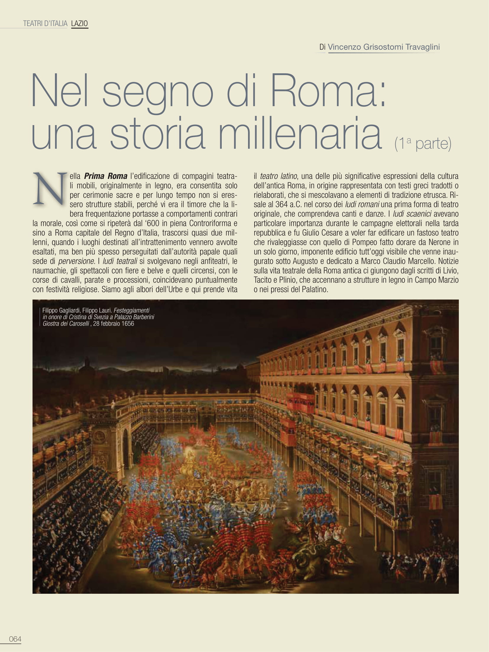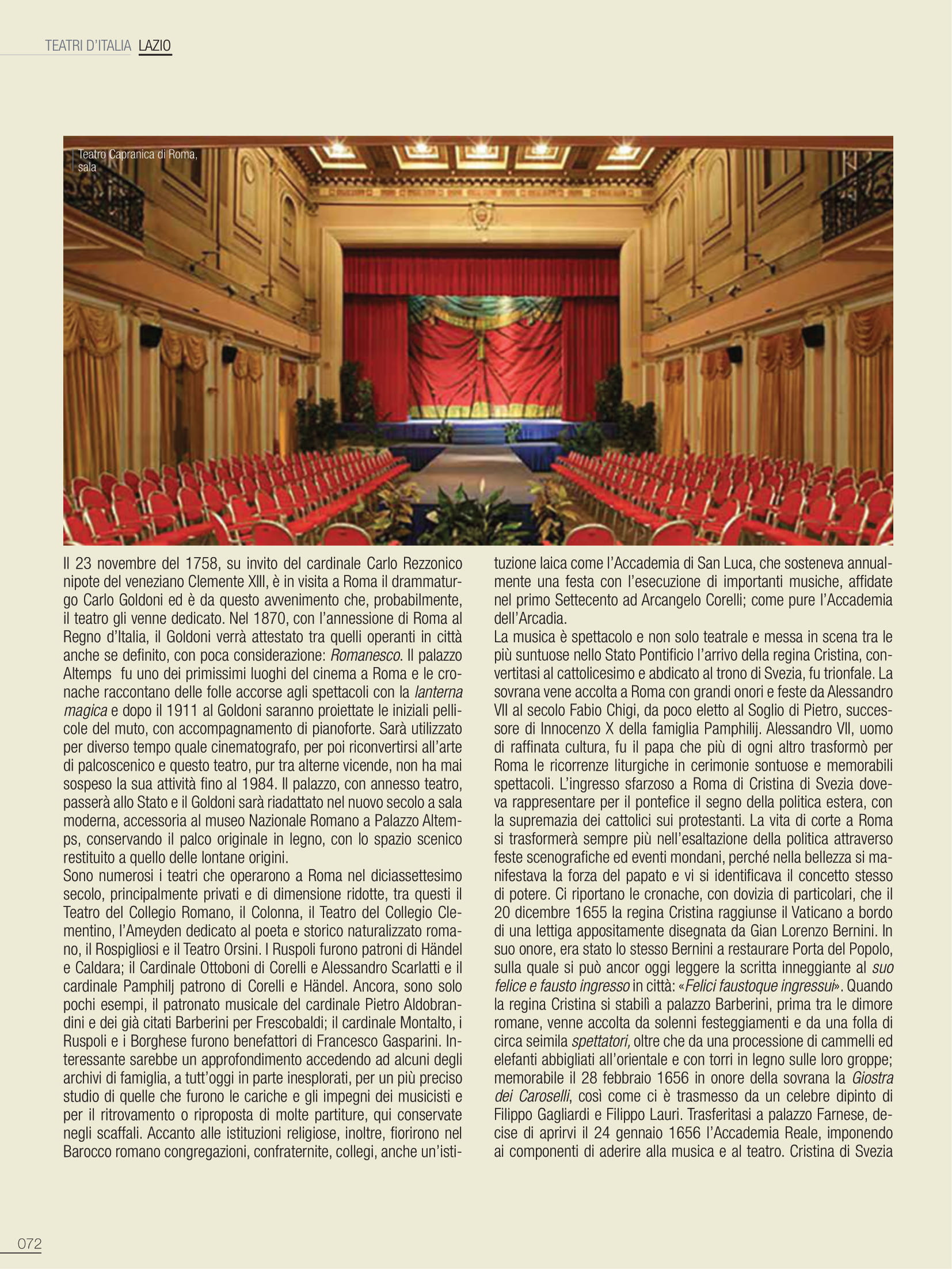 La musica è spettacolo e non solo teatrale e messa in scena tra le più suntuose nello Stato Pontificio l’arrivo della regina Cristina, convertitasi al cattolicesimo e abdicato al trono di Svezia, fu trionfale. La sovrana vene accolta a Roma con grandi onori e feste da Alessandro VII al secolo Fabio Chigi, da poco eletto al Soglio di Pietro, successore di Innocenzo X della famiglia Pamphilij. Alessandro VII, uomo di raffinata cultura, fu il papa che più di ogni altro trasformò per Roma le ricorrenze liturgiche in cerimonie sontuose e memorabili spettacoli. L’ingresso sfarzoso a Roma di Cristina di Svezia doveva rappresentare per il pontefice il segno della politica estera, con la supremazia dei cattolici sui protestanti. La vita di corte a Roma si trasformerà sempre più nell’esaltazione della politica attraverso feste scenografiche ed eventi mondani, perché nella bellezza si manifestava la forza del papato e vi si identificava il concetto stesso di potere. Ci riportano le cronache, con dovizia di particolari, che il 20 dicembre 1655 la regina Cristina raggiunse il Vaticano a bordo di una lettiga appositamente disegnata da Gian Lorenzo Bernini. In suo onore, era stato lo stesso Bernini a restaurare Porta del Popolo, sulla quale si può ancor oggi leggere la scritta inneggiante al suo felice e fausto ingresso in città: «Felici faustoque ingressui». Quando la regina Cristina si stabilì a palazzo Barberini, prima tra le dimore romane, venne accolta da solenni festeggiamenti e da una folla di circa seimila spettatori, oltre che da una processione di cammelli ed elefanti abbigliati all’orientale e con torri in legno sulle loro groppe; memorabile il 28 febbraio 1656 in onore della sovrana la Giostra dei Caroselli, così come ci è trasmesso da un celebre dipinto di Filippo Gagliardi e Filippo Lauri. Trasferitasi a palazzo Farnese, decise di aprirvi il 24 gennaio 1656 l’Accademia Reale, imponendo ai componenti di aderire alla musica e al teatro.