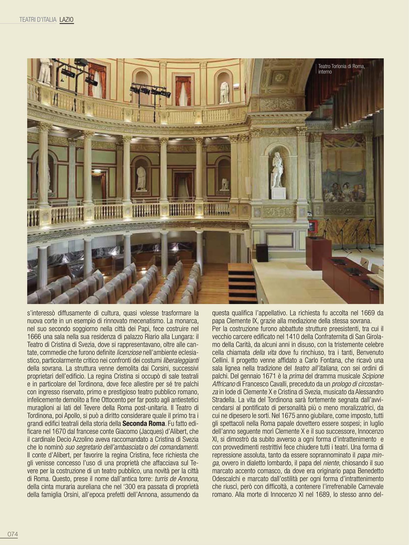 Questo, prese il nome dall’antica torre: turris de Annona, della cinta muraria aureliana che nel ‘300 era passata di proprietà della famiglia Orsini, all’epoca prefetti dell’Annona, assumendo da questa qualifica l’appellativo. La richiesta fu accolta nel 1669 da papa Clemente IX, grazie alla mediazione della stessa sovrana. Per la costruzione furono abbattute strutture preesistenti, tra cui il vecchio carcere edificato nel 1410 della Confraternita di San Girolamo della Carità, da alcuni anni in disuso, con la tristemente celebre cella chiamata della vita dove fu rinchiuso, tra i tanti, Benvenuto Cellini. Il progetto venne affidato a Carlo Fontana, che ricavò una sala lignea nella tradizione del teatro all’italiana, con sei ordini di palchi. Del gennaio 1671 è la prima del dramma musicale Scipione Affricano di Francesco Cavalli, preceduto da un prologo di circostanza in lode di Clemente X e Cristina di Svezia, musicato da Alessandro Stradella. La vita del Tordinona sarà fortemente segnata dall’avvicendarsi al pontificato di personalità più o meno moralizzatrici, da cui ne dipesero le sorti. Nel 1675 anno giubilare, come imposto, tutti gli spettacoli nella Roma papale dovettero essere sospesi; in luglio dell’anno seguente morì Clemente X e il suo successore, Innocenzo XI, si dimostrò da subito avverso a ogni forma d’intrattenimento e con provvedimenti restrittivi fece chiudere tutti i teatri. Una forma di repressione assoluta, tanto da essere soprannominato il papa minga, ovvero in dialetto lombardo, il papa del niente, chiosando il suo marcato accento comasco, da dove era originario papa Benedetto Odescalchi e marcato dall’ostilità per ogni forma d’intrattenimento che riuscì, però con difficoltà, a contenere l’irrefrenabile Carnevale romano. Alla morte di Innocenzo XI nel 1689, lo stesso anno della scomparsa di Cristina di Svezia, l’avvento al soglio pontificio del veneziano Alessandro VIII, nato Pietro Vito Ottoboni, permise la riapertura delle sale con la ripresa delle attività e fu l’occasione per il conte Giacomo d’Alibert di affidare nuovamente al Fontana il rinnovo del teatro.