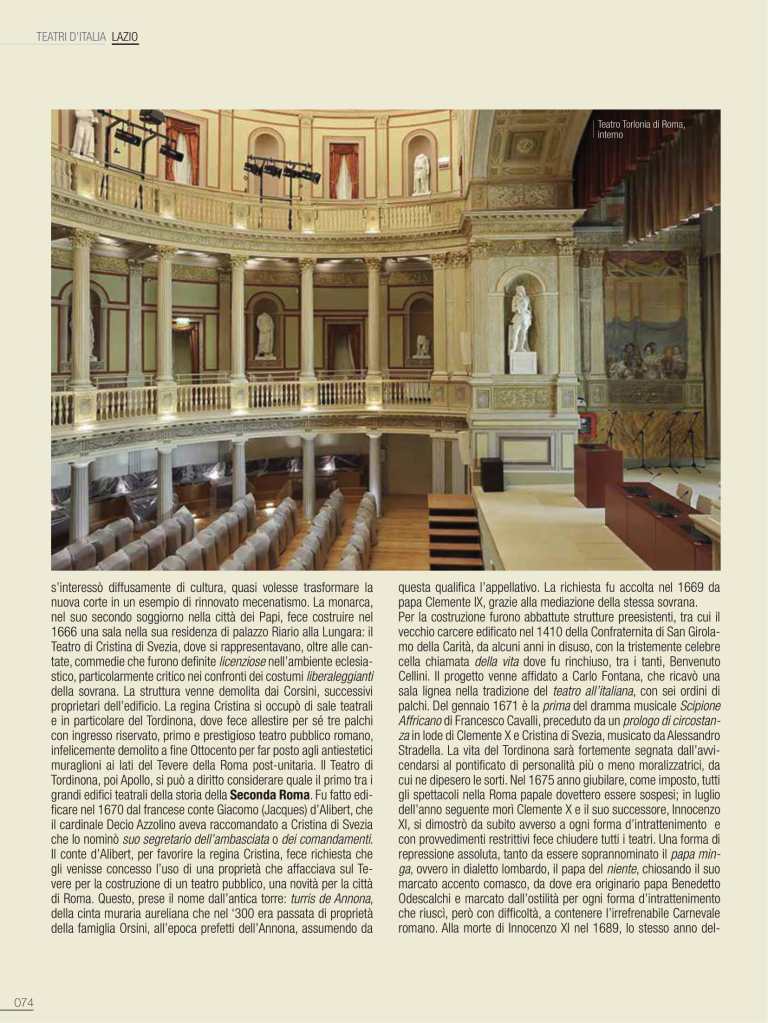 Cristina di Svezia s’interessò diffusamente di cultura, quasi volesse trasformare la nuova corte in un esempio di rinnovato mecenatismo. La monarca, nel suo secondo soggiorno nella città dei Papi, fece costruire nel 1666 una sala nella sua residenza di palazzo Riario alla Lungara: il Teatro di Cristina di Svezia, dove si rappresentavano, oltre alle cantate, commedie che furono definite licenziosenell’ambiente eclesiastico, particolarmente critico nei confronti dei costumi liberaleggianti della sovrana. La struttura venne demolita dai Corsini, successivi proprietari dell’edificio. La regina Cristina si occupò di sale teatrali e in particolare del Tordinona, dove fece allestire per sé tre palchi con ingresso riservato, primo e prestigioso teatro pubblico romano, infelicemente demolito a fine Ottocento per far posto agli antiestetici muraglioni ai lati del Tevere della Roma post-unitaria. Il Teatro di Tordinona, poi Apollo, si può a diritto considerare quale il primo tra i grandi edifici teatrali della storia della Seconda Roma. Fu fatto edificare nel 1670 dal francese conte Giacomo (Jacques) d’Alibert, che il cardinale Decio Azzolino aveva raccomandato a Cristina di Svezia che lo nominò suo segretario dell’ambasciata o dei comandamenti. Il conte d’Alibert, per favorire la regina Cristina, fece richiesta che gli venisse concesso l’uso di una proprietà che affacciava sul Tevere per la costruzione di un teatro pubblico, una novità per la città di Roma.