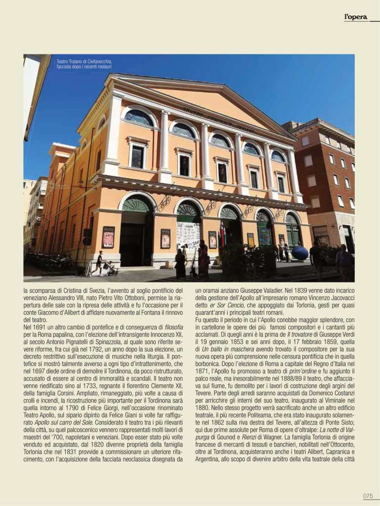 Nel 1691 un altro cambio di pontefice e di conseguenza di filosofia per la Roma papalina, con l’elezione dell’intransigente Innocenzo XII, al secolo Antonio Pignatelli di Spinazzola, al quale sono riferite severe riforme, fra cui già nel 1792, un anno dopo la sua elezione, un decreto restrittivo sull’esecuzione di musiche nella liturgia. Il pontefice si mostrò talmente avverso a ogni tipo d’intrattenimento, che nel 1697 diede ordine di demolire il Tordinona, da poco ristrutturato, accusato di essere al centro di immoralità e scandali. Il teatro non venne riedificato sino al 1733, regnante il fiorentino Clemente XII, della famiglia Corsini. Ampliato, rimaneggiato, più volte a causa di crolli e incendi, la ricostruzione più importante per il Tordinona sarà quella intorno al 1790 di Felice Giorgi, nell’occasione rinominato Teatro Apollo, sul sipario dipinto da Felice Giani si volle far raffigurato Apollo sulcarro del Sole. Considerato il teatro tra i più rilevanti della città, su quel palcoscenico vennero rappresentati molti lavori di maestri del ‘700, napoletani e veneziani. Dopo esser stato più volte venduto ed acquistato, dal 1820 divenne proprietà della famiglia Torlonia che nel 1831 provvide a commissionare un ulteriore rifacimento, con l’acquisizione della facciata neoclassica disegnata da un oramai anziano Giuseppe Valadier.