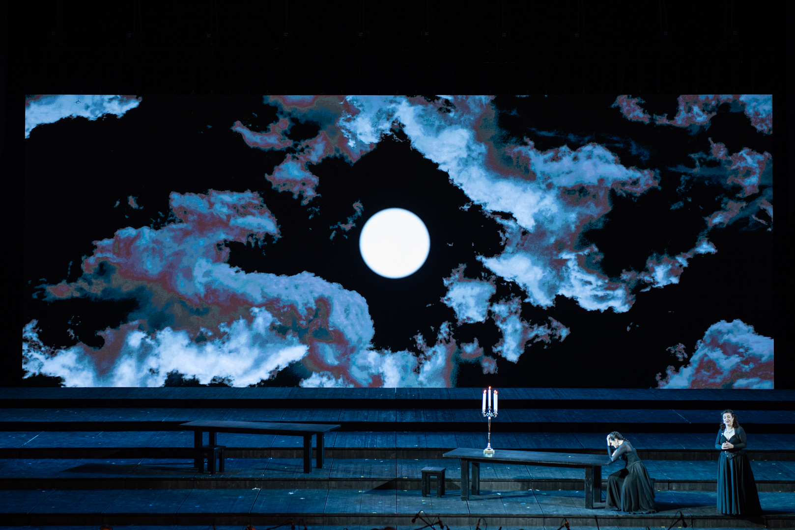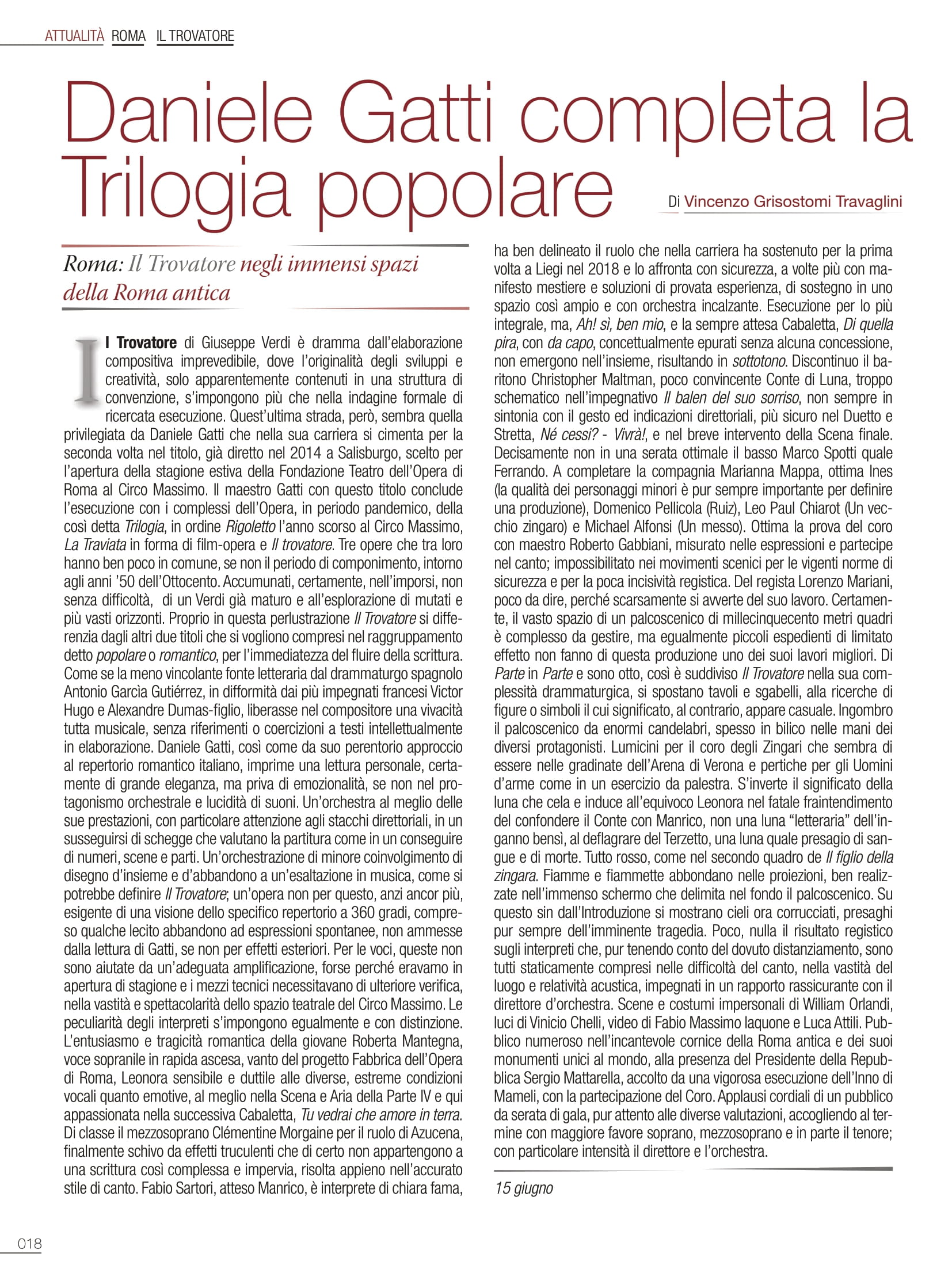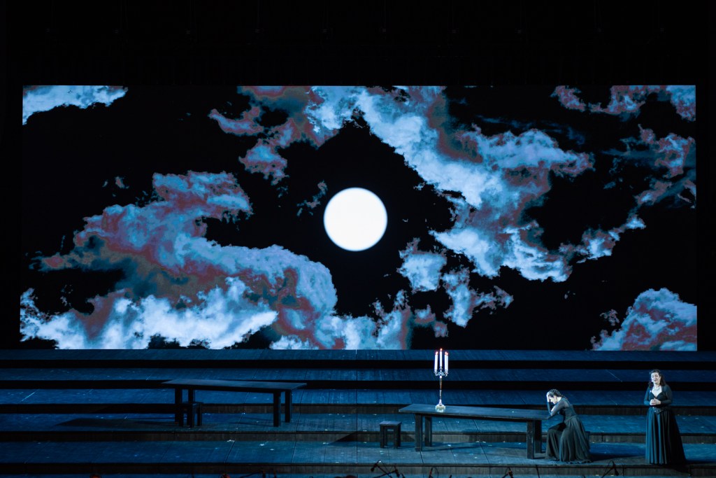 Del regista Lorenzo Mariani, poco da dire, perché scarsamente si avverte del suo lavoro. Certamente, il vasto spazio di un palcoscenico di millecinquecento metri quadri è complesso da gestire, ma egualmente piccoli espedienti di limitato effetto non fanno di questa produzione uno dei suoi lavori migliori. Di Parte in Parte e sono otto, così è suddiviso Il trovatore nella sua complessità drammaturgica, si spostano tavoli e sgabelli, alla ricerche di figure o simboli il cui significato, al contrario, appare casuale. Ingombro il palcoscenico da enormi candelabri, spesso in bilico nelle mani dei diversi protagonisti. Lumicini per il coro degli Zingari che sembra di essere nelle gradinate dell’Arena di Verona e pertiche per gli Uomini d’arme come in un esercizio da palestra. S’inverte il significato della luna che cela e induce all’equivoco Leonora nel fatale fraintendimento del confondere il Conte con Manrico, non una luna “letteraria” dell’inganno bensì, al deflagrare del Terzetto, una luna quale presagio di sangue e di morte. Tutto rosso, come scontatamente nel secondo quadro de Il figlio della zingara. Fiamme e fiammette abbondano nelle proiezioni, ben realizzate nell’immenso schermo che delimita nel fondo il palcoscenico. Su questo sin dall’Introduzione si mostrano cieli ora corrucciati e al contrario costellati, presaghi pur sempre dell’imminente tragedia. Poco, nulla il risultato registico sugli interpreti che, pur tenendo conto del dovuto distanziamento, sono tutti staticamente compresi nelle difficoltà del canto, nella vastità del luogo e relatività acustica, impegnati in un rapporto rassicurante con il direttore d’orchestra. Scene e costumi impersonali di William Orlandi, luci di Vinicio Chelli, video di Fabio Massimo Iaquone e Luca Attili. Pubblico numeroso nell’incantevole cornice della Roma antica e dei suoi monumenti unici al mondo, alla presenza del Presidente della Repubblica Sergio Mattarella, accolto da una vigorosa esecuzione dell’Inno di Mameli, con la partecipazione del coro. Applausi cordiali di un pubblico da serata di gala, pur attento alle diverse valutazioni, accogliendo al termine con maggiore favore soprano, mezzosoprano e in parte il tenore; con particolare intensità il direttore e l’orchestra.