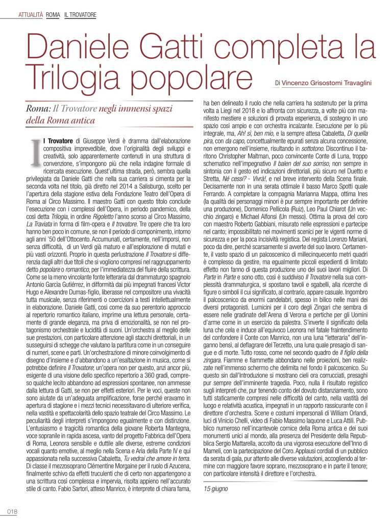 Il Trovatore di Giuseppe Verdi è dramma dall’elaborazione compositiva imprevedibile, dove l’originalità degli sviluppi e creatività, solo apparentemente contenuti in una struttura di convenzione, s’impongono più che nella indagine formale di ricercata esecuzione. Quest’ultima strada, però, sembra quella privilegiata da Daniele Gatti che nella sua carriera si cimenta per la seconda volta nel titolo, già diretto nel 2014 a Salisburgo, scelto per l’apertura della stagione estiva della Fondazione Teatro dell’Opera di Roma al Circo Massimo. Il maestro Gatti con questo titolo conclude l’esecuzione con i complessi dell’Opera, in periodo pandemico, della così detta trilogia, in ordine Rigoletto l’anno scorso al Circo Massimo, La traviata in forma di film-opera e Il trovatore. Tre opere che tra loro hanno ben poco in comune, se non il periodo di compimento, intorno agli anni ’50 dell’Ottocento.