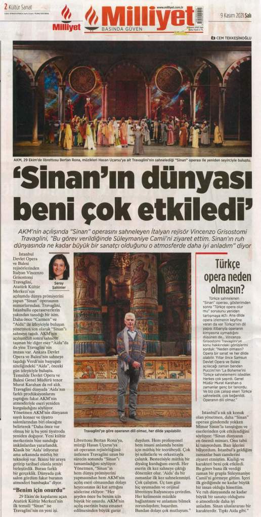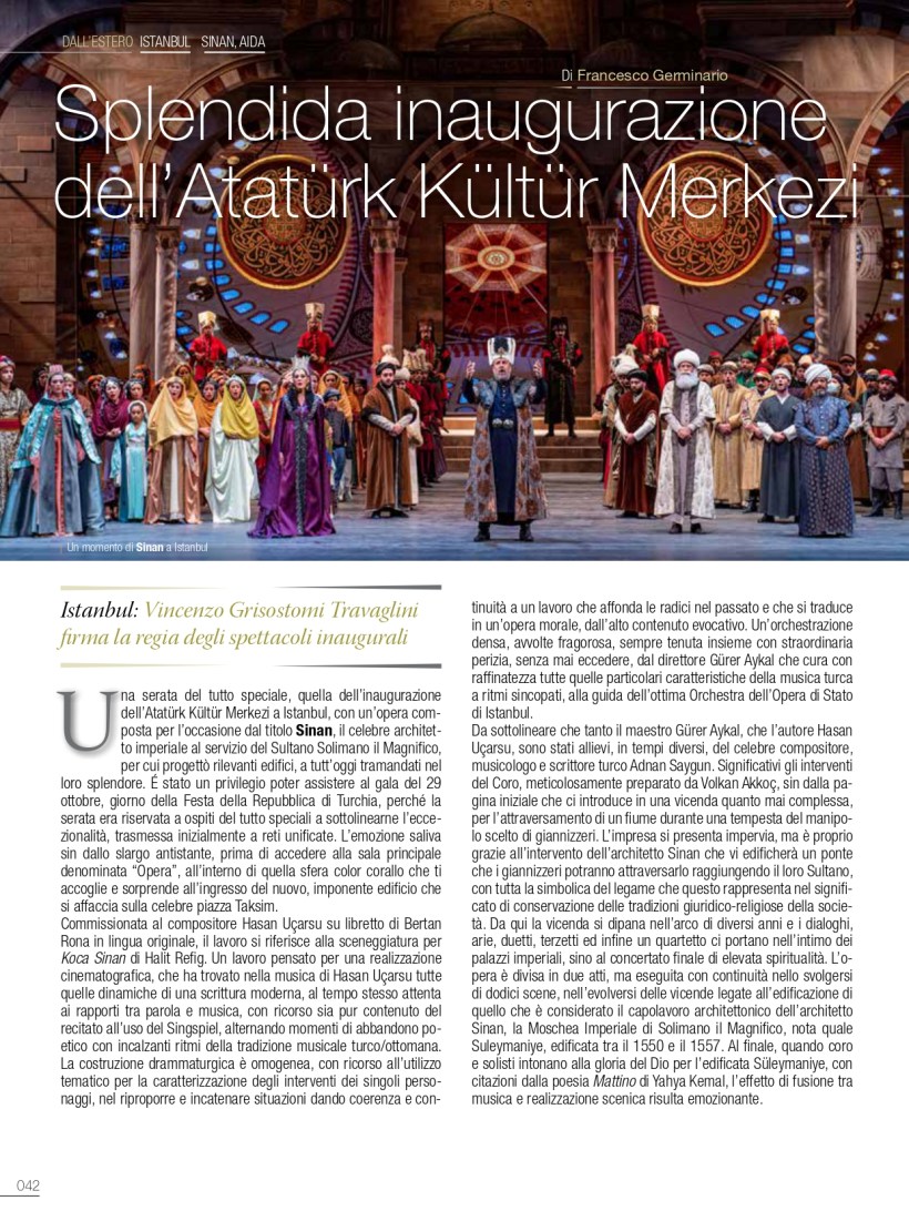 Una serata del tutto speciale, quella dell’inaugurazione dell’Atatürk Kültür Merkezi a Istanbul, con un’opera composta per l’occasione dal titolo Sinan, il celebre architetto imperiale al servizio del Sultano Solimano il Magnifico, per cui progettò rilevanti edifici, a tutt’oggi tramandati nel loro splendore. E’ stato un privilegio poter assistere al gala del 29 ottobre, giorno della Festa della Repubblica di Turchia, perché la serata era riservata a ospiti del tutto speciali a sottolinearne l’eccezionalità, trasmessa inizialmente a reti unificate. L’emozione saliva sin dallo slargo antistante, prima di accedere alla sala principale denominata “Opera”, all’interno di quella sfera color corallo che ti accoglie e sorprende all’ingresso del nuovo, imponente edificio che si affaccia sulla celebre piazza Taksim.