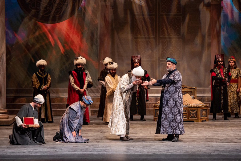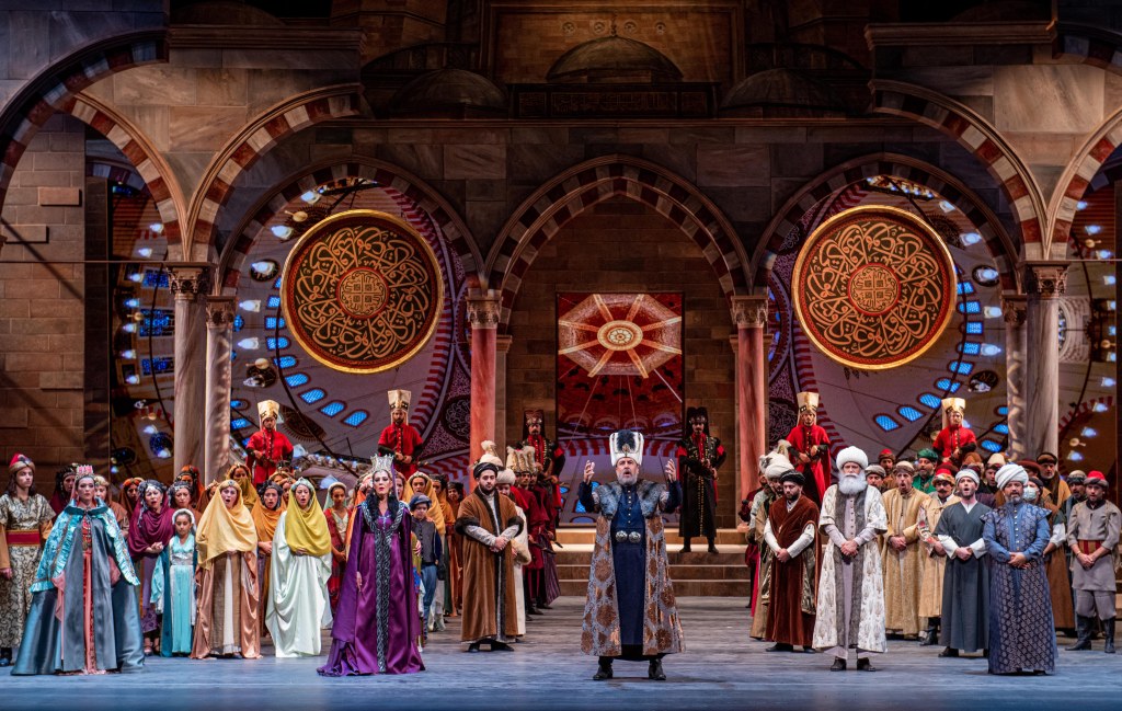 Commissionata al compositore Hasan Uçarsu su libretto di Bertan Rona in lingua originale, il lavoro si riferisce alla sceneggiatura per Koca Sinan di Halit Refiğ. Un lavoro pensato per una realizzazione cinematografica, che ha trovato nella musica di Hasan Uçarsu tutte quelle dinamiche di una scrittura moderna, al tempo stesso attenta ai rapporti tra parola e musica, con ricorso sia pur contenuto del recitato all’uso del Singspiel, alternando momenti di abbandono poetico con incalzanti ritmi della tradizione musicale turco/ottomana. La costruzione drammaturgica è omogenea, con ricorso all’utilizzo tematico per la caratterizzazione degli interventi dei singoli personaggi, nel riproporre e incatenare situazioni dando coerenza e continuità a un lavoro che affonda le radici nel passato e che si traduce in un’opera morale, dall’alto contenuto evocativo. Un’orchestrazione densa, avvolte fragorosa, sempre tenuta insieme con straordinaria perizia, senza mai eccedere, dal direttore Gürer Aykal che cura con raffinatezza tutte quelle particolari caratteristiche della musica turca a ritmi sincopati, alla guida dell’ottima Orchestra dell’Opera di Stato di Istanbul. Da sottolineare che tanto il maestro Gürer Aykal, che l’autore Hasan Uçarsu, sono stati allievi, in tempi diversi, del celebre compositore, musicologo e scrittore turco Adnan Saygun. Significativi gli intervento del Coro, meticolosamente preparato da Volkan Akkoç, sin dalla pagina iniziale che c’introduce in una vicenda quanto mai complessa, per l’attraversamento di un fiume durante una tempesta del manipolo scelto di giannizzeri. L’impresa si presenta impervia, ma è proprio grazie all’intervento dell’architetto Sinan che vi edificherà un ponte che i giannizzeri potranno attraversarlo raggiungendo il loro Sultano, con tutta la simbolica del legame che questo rappresenta nel significato di conservazione delle tradizioni giuridico-religiose della società. Da qui la vicenda si dipana nell’arco di diversi anni e i dialoghi, arie, duetti, terzetti ed infine un quartetto ci portano nell’intimo dei palazzi imperiali, sino al concertato finale di elevata spiritualità. L’opera è divisa in due atti, ma eseguita con continuità nello svolgersi di dodici scene, nell’evolversi delle vicende legate all’edificazione di quello che è considerato il capolavoro architettonico dell’architetto Sinan, la Moschea Imperiale di Solimano il Magnifico, nota quale Suleymaniye, edificata tra il 1550 e il 1557. Al finale, quando coro e solisti intonano alla gloria del Dio per l’edificata Süleymaniye, con citazioni dalla poesia Mattino di Yahya Kemal, l’effetto di fusione tra musica e realizzazione scenica risulta emozionante. Perfetta sintonia tra podio e palcoscenico, grazie al regista Vincenzo Grisostomi, alla collaborazione per la drammaturgia e ricerca storica di Sisowath Ravivaddhana Monipong, al disegno luci di Giovanni Pirandello. Un palcoscenico che di scena in scena plasma figurazioni di rara suggestione. Scene di Zeki Sarayoğlu; costumi di Serdar Başbuğ che ha disegnato e realizzato gli abiti con minuziosa precisione, riportandoci appieno allo stile dell’Impero Ottomano, nel pieno del suo fulgore. Proiezioni di Burak Yıldırım e immagini LED progettate da Ahmet Şeren, che rispettivamente hanno aggiunto tocchi creativi con proiezioni di miniature sui siparietti tra le diverse scene, congiunte da interludi all’uso francese d’inizio Novecento e nei fondali decorazioni di preziosi arredi e riproduzioni d’epoca, donando profondità al palcoscenico, anche con l’uso di discrete, quanto efficaci, animazioni. L’opera è stata replicata il giorno seguente con una diversa compagnia di canto, a sala esaurita in ogni ordine di posti. Differenti gli interpreti nelle due serate, tutti indistintamente immedesimati nei propri ruoli. Per Sinan il tenore Efe Kişlali che ha vissuto le rivelazioni del protagonista con sentita interiorità e nella seconda recita Ali Murat Erengül; maestoso il Sultan Süleyman del basso Tuncay Kurtoğlu e nella replica Suat Arikan; il fascino e la determinazione di Hürrem Sultan, moglie di Solimano, sono stati restituiti con dominio della scena dal mezzo-soprano Aylin Ateş ed egualmente da Nesrin Gönüldağ; la figlia di Solimano, Mihrimah Sultan, interpretata con grazia dal soprano Gülbin Günay e il giorno successivo da Hale Soner Kekeç; di particolare efficacia nel ruolo di Rüstem Paşa il basso/baritono KevorkTavityan e l’apprezzato N. Işık Belen; completano la compagnia Göktuğ Alpaşar e Umut Tingür (Ebussuud Efendi) ; Onur Turan e Berk Dalkılıç (Ayas Paşa e Sinan’ın Kalfası).