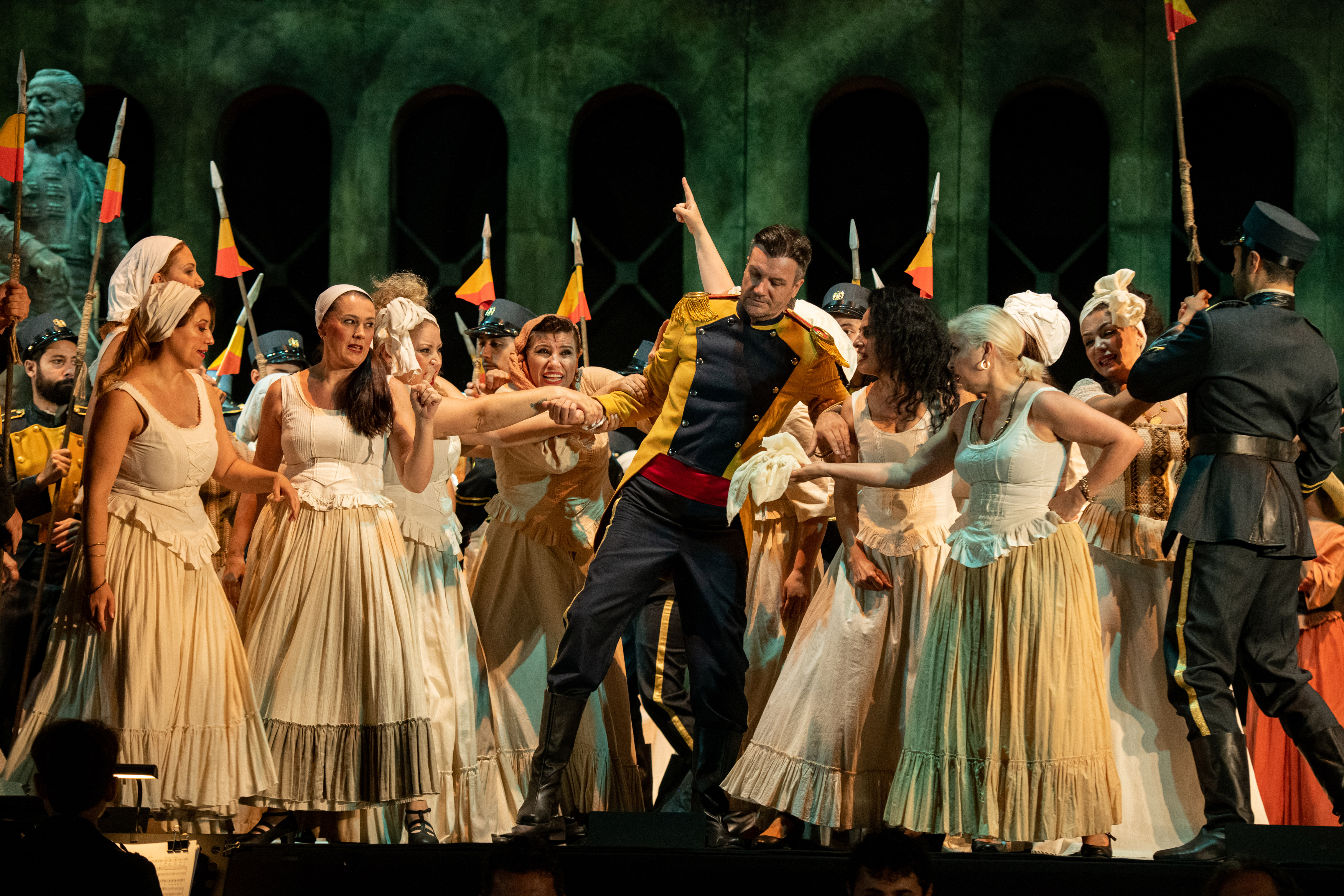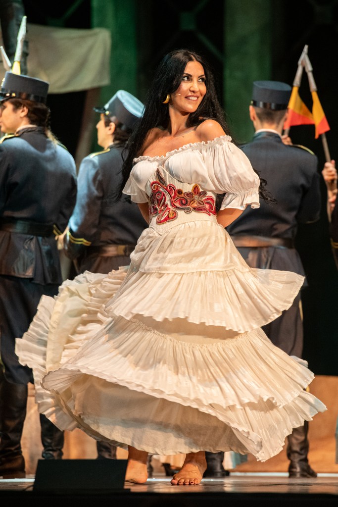 Ogni suggestione, però, ha il suo prezzo da pagare e l’acustica è pressoché carente e l’amplificazione non adeguata. Questo non dissuade dal godimento della produzione e nella compagnia di canto svetta la sensuale, magnetica Ramona Zaharia. Del ruolo di Carmen lei ha capito tutto, si muove con sicurezza, con autentico timbro da mezzosoprano tendente a un brunito con effetto penetrante, che riconduce con determinazione il personaggio nell’incognita segnata dall’inesorabile destino. Esemplare l’Habanera, la Séguédille e in generale si distingue in ogni suo intervento, in particolar modo nel così detto terzetto delle carte del terzo atto da Voyons, que j’essaie à mon tour.