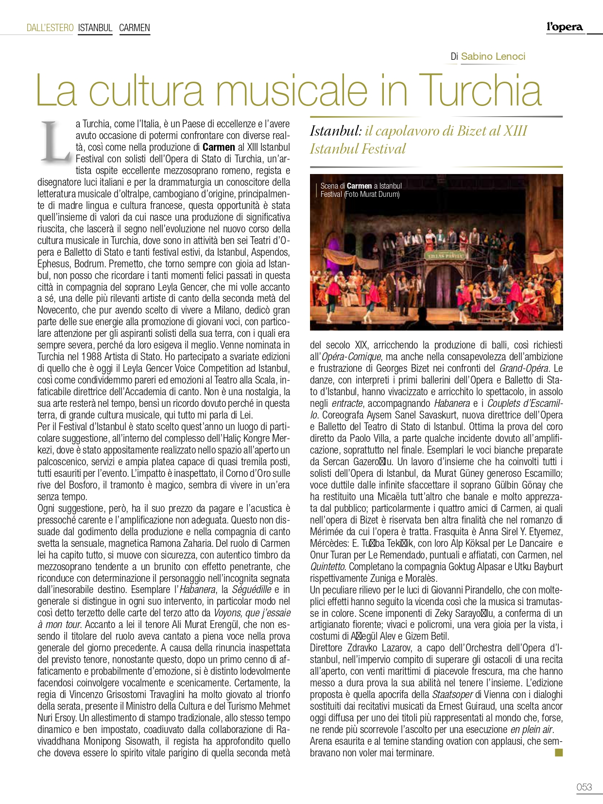 La Turchia, come l’Italia, è un Paese di eccellenze e l’avere avuto occasione di potermi confrontare con diverse realtà, così come nella produzione di Carmen al XIII Istanbul Festival con solisti dell’Opera di Stato di Turchia, un’artista ospite eccellente mezzosoprano romeno, regista e disegnatore luci italiani e per la drammaturgia un conoscitore della letteratura musicale d’oltralpe, cambogiano d’origine, principalmente di madre lingua e cultura francese, questa opportunità è stata quell’insieme di valori da cui nasce una produzione di significativa riuscita, che lascerà il segno nell’evoluzione nel nuovo corso della cultura musicale in Turchia, dove sono in attività ben sei Teatri d’Opera e Balletto di Stato e tanti festival estivi, da Istanbul, Aspendos, Ephesus, Bodrum.