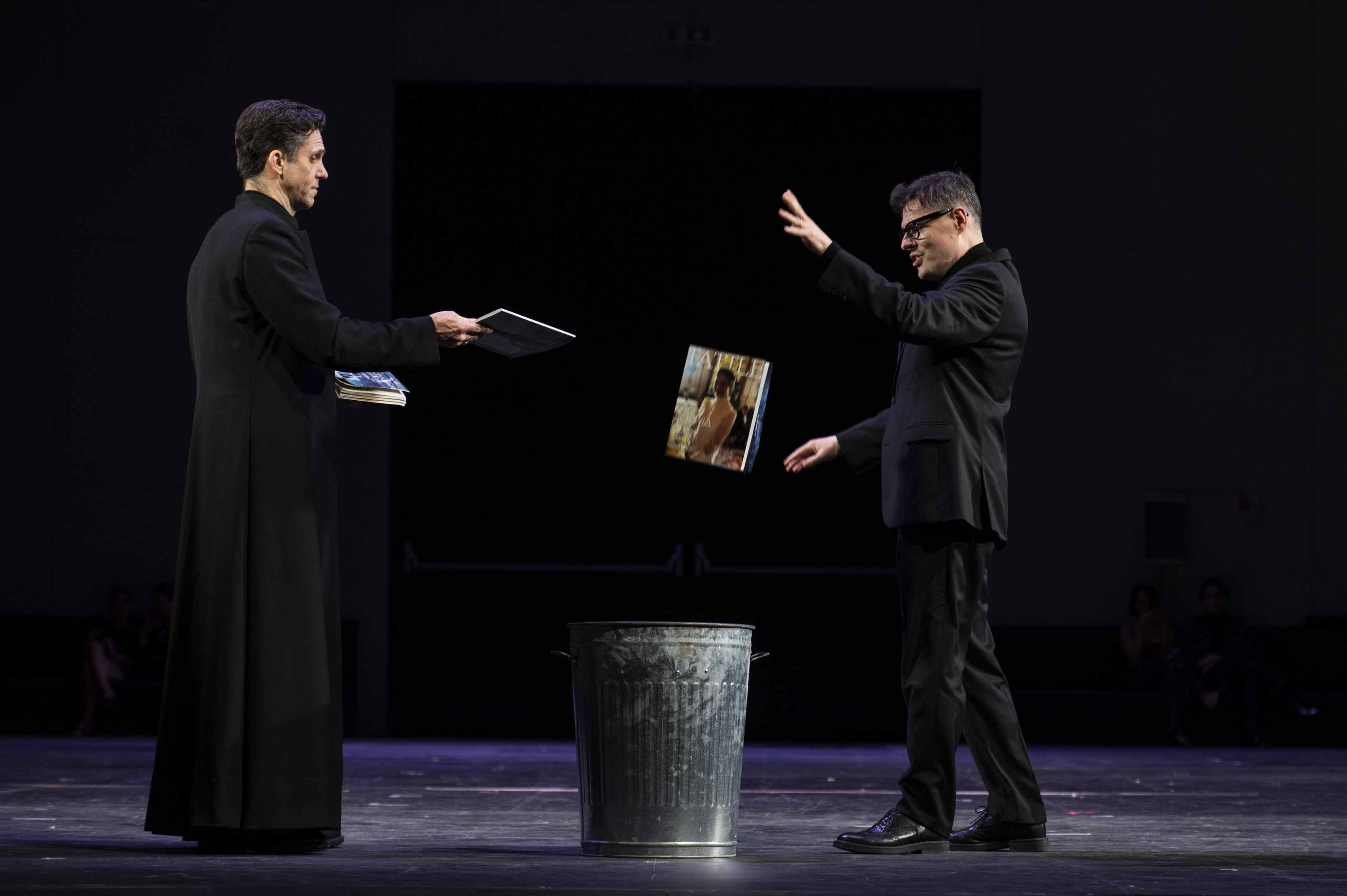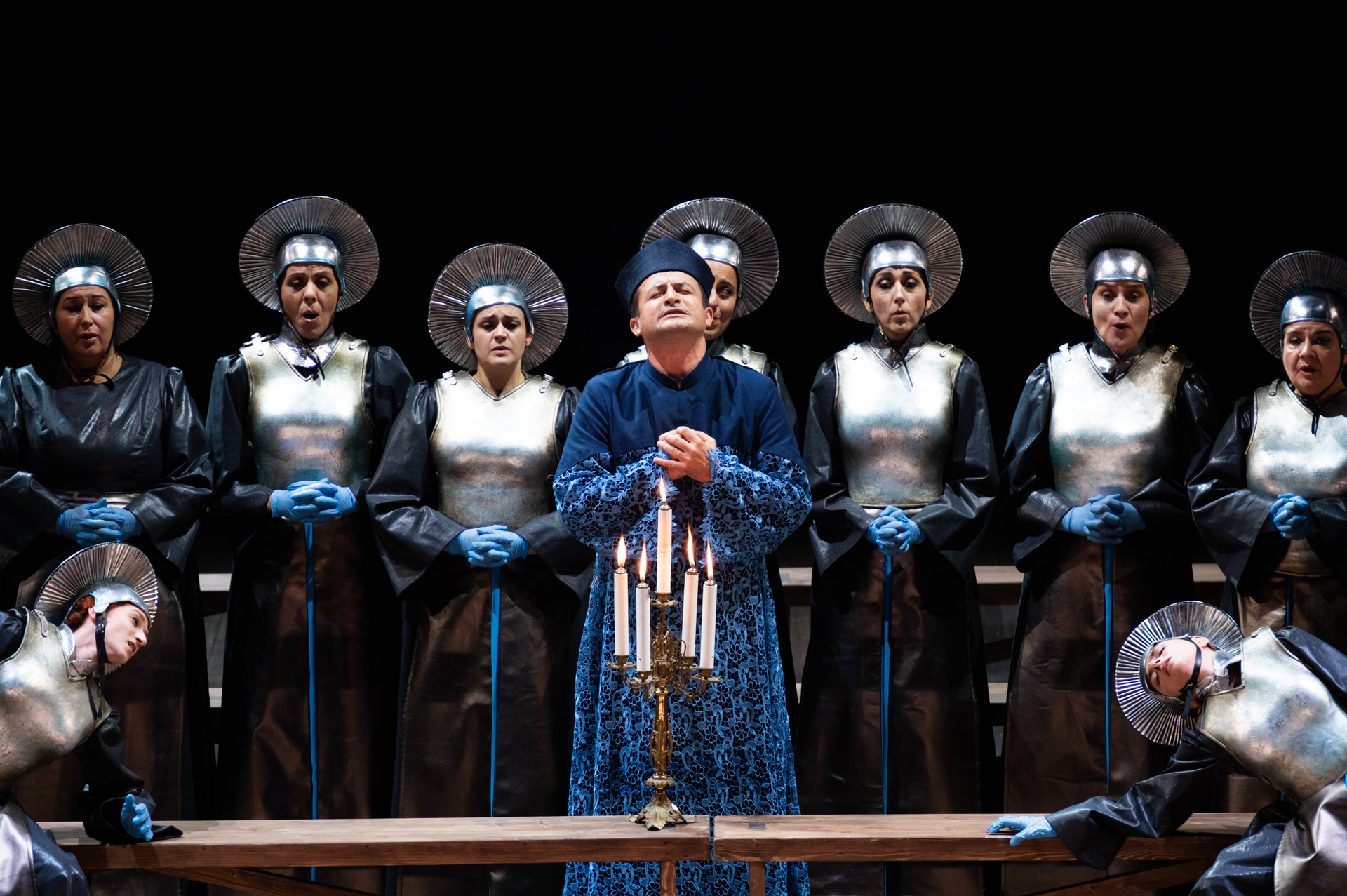 A nudo, in resistenza concettuale a quell’essenzialità di costrizione monastica, infine enfatizzandone l’apoteosi di martirio universale distanziandosi, però, dalla spiritualità fondante la drammaturgia di Bernanos/Poulenc. Argomento prioritario, per la regia, è la violenza contro le donne, figure che svaniscono nel vuoto dietro una candida tela allo scandire della lama! Insomma, tanti altri cammini di una realtà contorta e lacerante, ma con Emma Dante è pur sempre teatro segnato da un’attualità che impone forza nella denuncia della condizione femminile. Come spesso negli allestimenti della celebre regista i movimenti mimici/coreografici sono insistenti sino all’esaurimento, a cura di Sandro Campagna. L’apparato scenico di Carmine Maringola rimanda a simbolismi di luogo e d’argomento, reclamante sovrabbondanti crocifissi, all’apologia del Cristo-donna. Con il fondamentale apporto delle luci di Cristian Zucaro, l’allestimento rende fluidità all’affastellamento attuativo imprimendovi significati o sottintesi, distinguendosi per la nitidezze di forme lineari nell’inquadrature di cornici dai molti utilizzi, eloquenti dell’ossessività narrativa, con colori riferenti lo stato emozionale dei personaggi. Raffigurazioni senza limite temporale, grate conventuali come sbarre di prigione. Piena sintonia nei costumi di Vanessa Sannino, sfarzosi abiti, tuniche e armature di combattenti alla “Giovanna d’Arco” con simil-aureole santificanti (le Carmelitane del convento di Compiègne furono beatificate da Pio X) e riferimenti molteplici, funzionali a un discorso parallelo, perché ai realizzatori non importa della semiotica cristiana, bensì personali convincimenti. Poco, nulla, aggiungono appesantimenti funebri, quali i cinquecento teschi (tipo Catacomba a Palermo o Cripta a Roma dei Cappuccini), che, piuttosto che terrificanti, appaiono farseschi. Le chincaglierie non mancano, con le pietre d’iniziazione a schiacciare sadicamente i piedi delle novizie, la loro notturna fuga liberatoria, felici pedalando biciclette gialle. Uno spettacolo avvincente, malgrado l’indifferenza a quel messaggio distinto di riflessione sul dramma della solitudine.