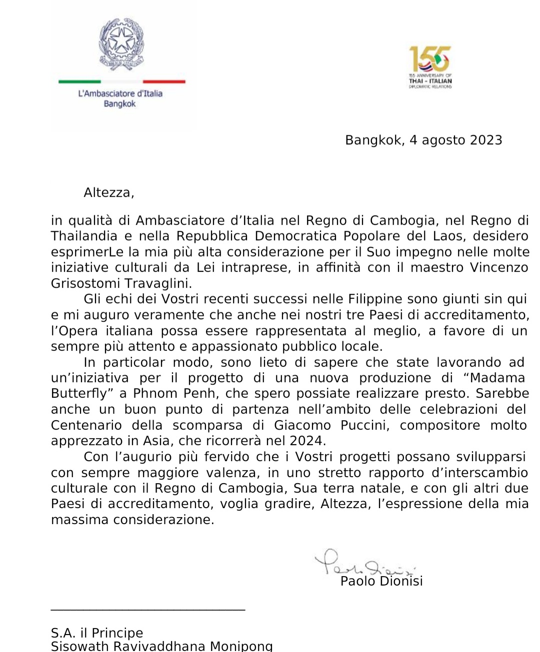 as the Ambassador of Italy to the Kingdom of Cambodia, the Kingdom of Thailand and the Lao People’s Democratic Republic, I wish to express to you my highest consideration for your commitment to the many cultural initiatives you have undertaken, in affinity with Maestro Vincenzo Grisostomi Travaglini. The echoes of Your recent successes in the Philippines have reached here and I truly hope that also in our three countries of accreditation, Italian Opera can be represented at its best, for the benefit of an increasingly attentive and passionate local audience. Especially, I am glad to know that you are working on an initiative to plan a new production of “Madama Butterfly” in Phnom Penh, which I hope you will be able to realize soon. It would also be a good starting point as part of the celebrations of the Centenary of the passing of Giacomo Puccini, a highly regarded composer in Asia, which will occur in 2024. With the most fervent wish that your projects may develop with ever greater significance, in a close relationship of cultural interchange with the Kingdom of Cambodia, your native land, and with the other two countries of accreditation, please accept, Your Highness, the expression of my highest consideration.