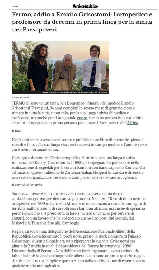 Negli anni scorsi una delegazione dell’Associazione Nazionale Alfieri della Repubblica aveva incontrato il professore, presso la storica dimora di Palazzo Grisostomi, durante il quale era stata ripercorsa la sua vita. Grisostomi era giunto in Zambia in qualità di presidente del Rotary International 2090° Distretto Italia di Fermo. «Non dobbiamo farci ingannare – aveva scritto – da false illusioni: la vita è un lungo viale alberato con tante ombre e qualche raggio di sole che filtra tra le foglie e questo è dato dalla soddisfazione di essere stato in qualche modo utile agli altri».