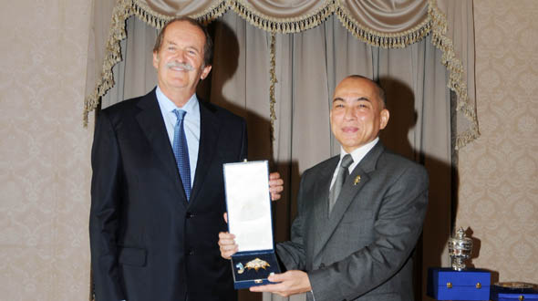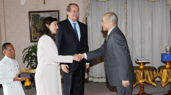 LL.AA.RR. le Duc et la Duchesse de Bragance, prétendants au Trône du Portugal, reçus en audience privée par Sa Majesté le Roi Norodom Sihamoni le 29 juillet dernier. A cette occasion, le Duc de Bragance a remis à Sa Majesté le Roi les insignes de Grand Croix de l’Ordre de l’Immaculée Conception de Vila Viçosa, ordre dynastique portugais créé en 1819 et attaché à la maison de Bragance, qui est toujours concédé par les prétendants à la couronne.