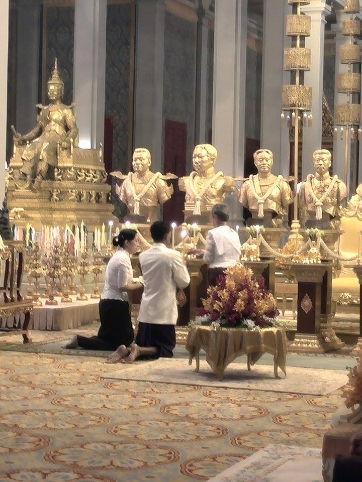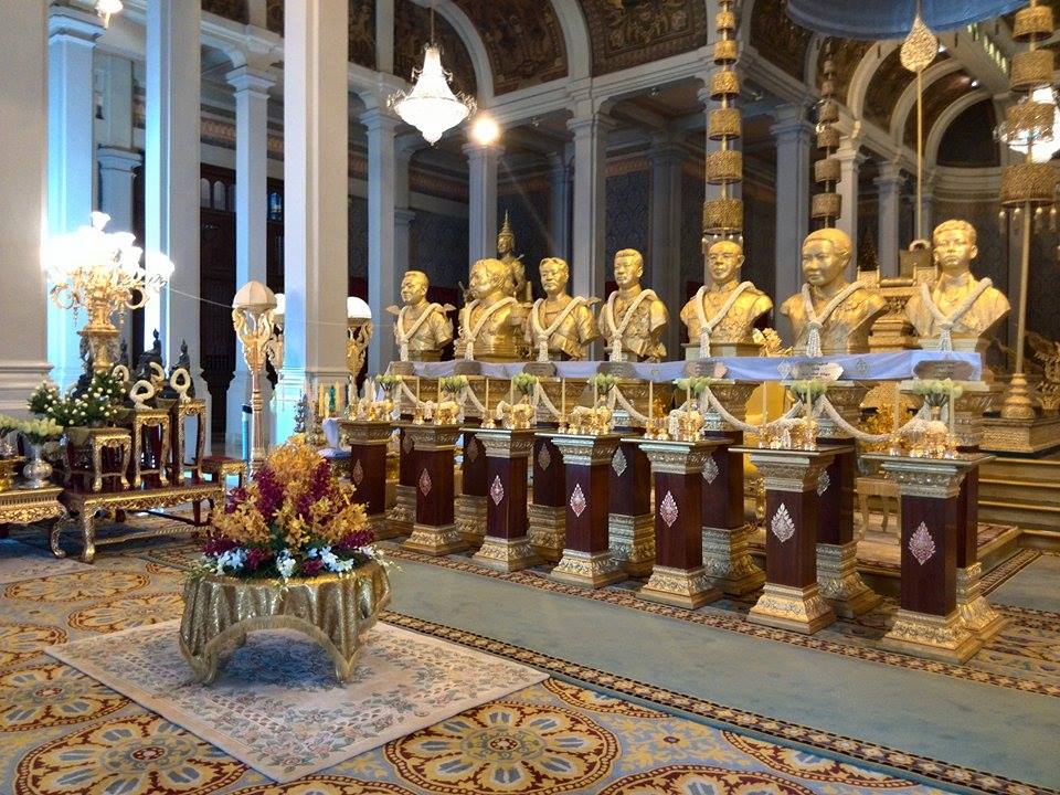 Les bustes des Rois et Reines défuntes de la Dynastie Khmère dans la Salle du Trône, depuis le règne du Roi Ang Duong: SM le Roi Ang Duong (1841-1860) SM le Roi Norodom (1860-1904) SM le Roi Sisowath (1904-1927) SM le Roi Sisowath Monivong (1927-1941) SM le Roi Norodom Suramarit (1955-1960) SM la Reine Sisowath Kossamak Nearirath Serey Vatthana (1955-1975) SM le Roi Norodom Sihanouk (1941-2004)