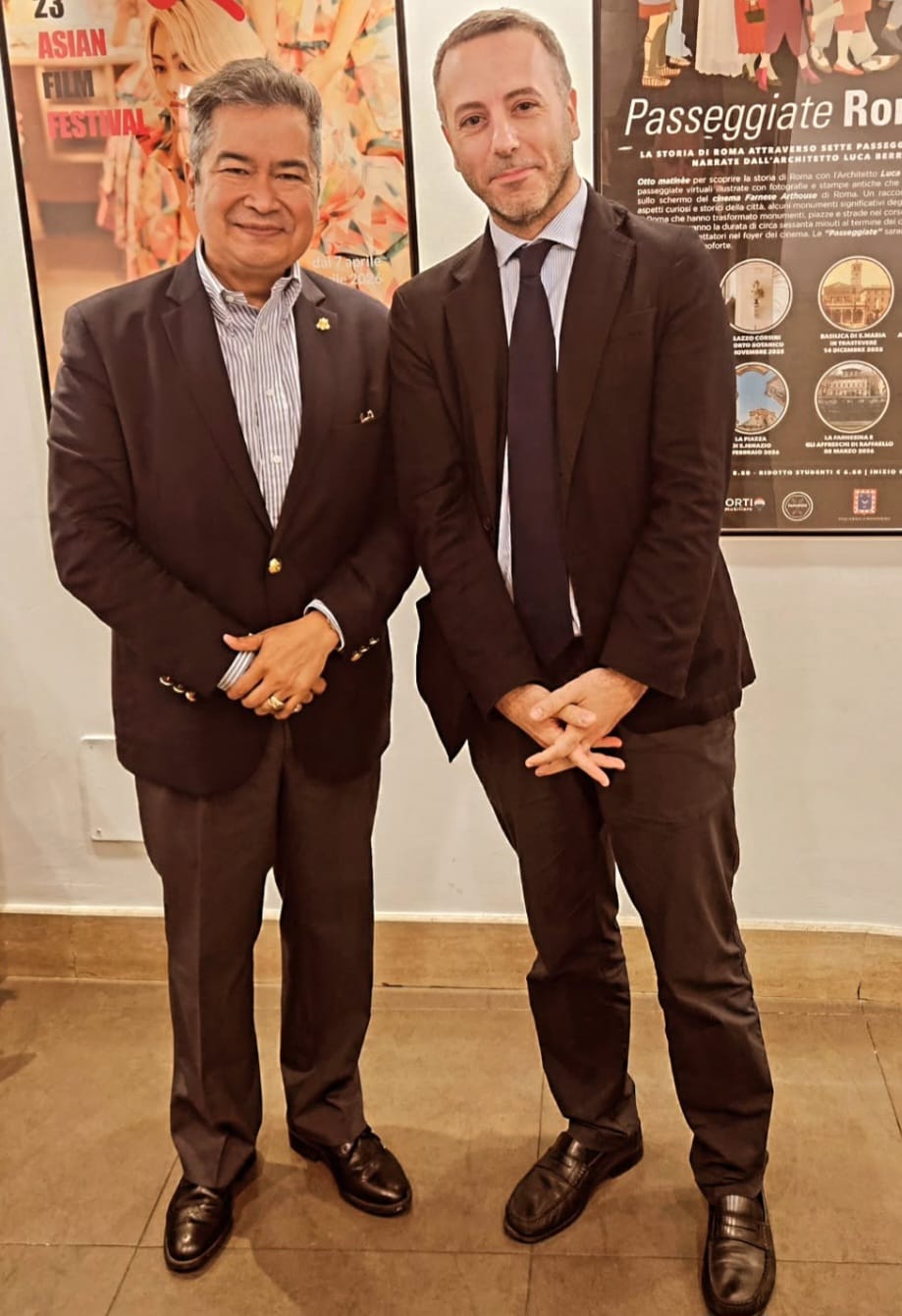 Prince Sisowath Ravivaddhana Monipong and famous italian television journalist Francesco Maesano at the 23rd edition of Asian Cinema Festival in Rome on 15th April 2026