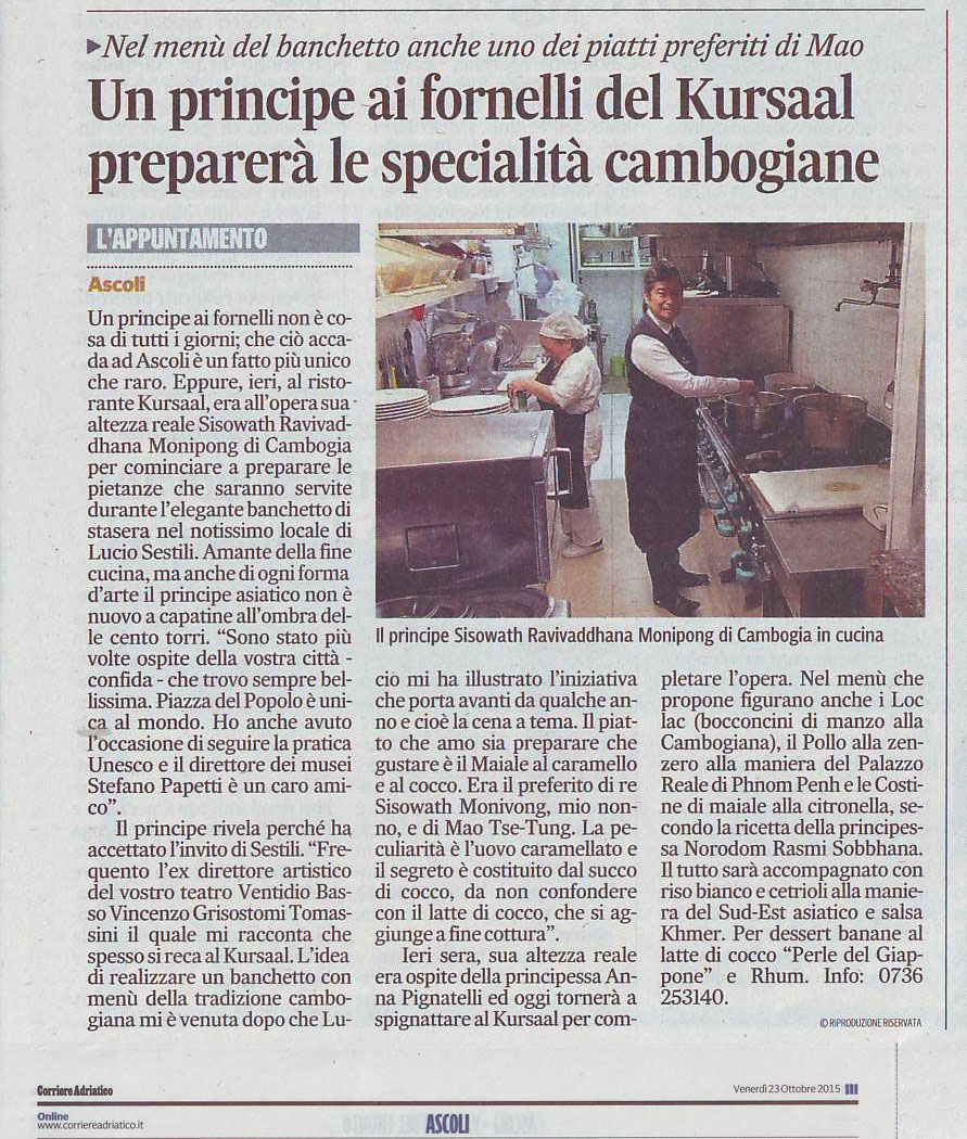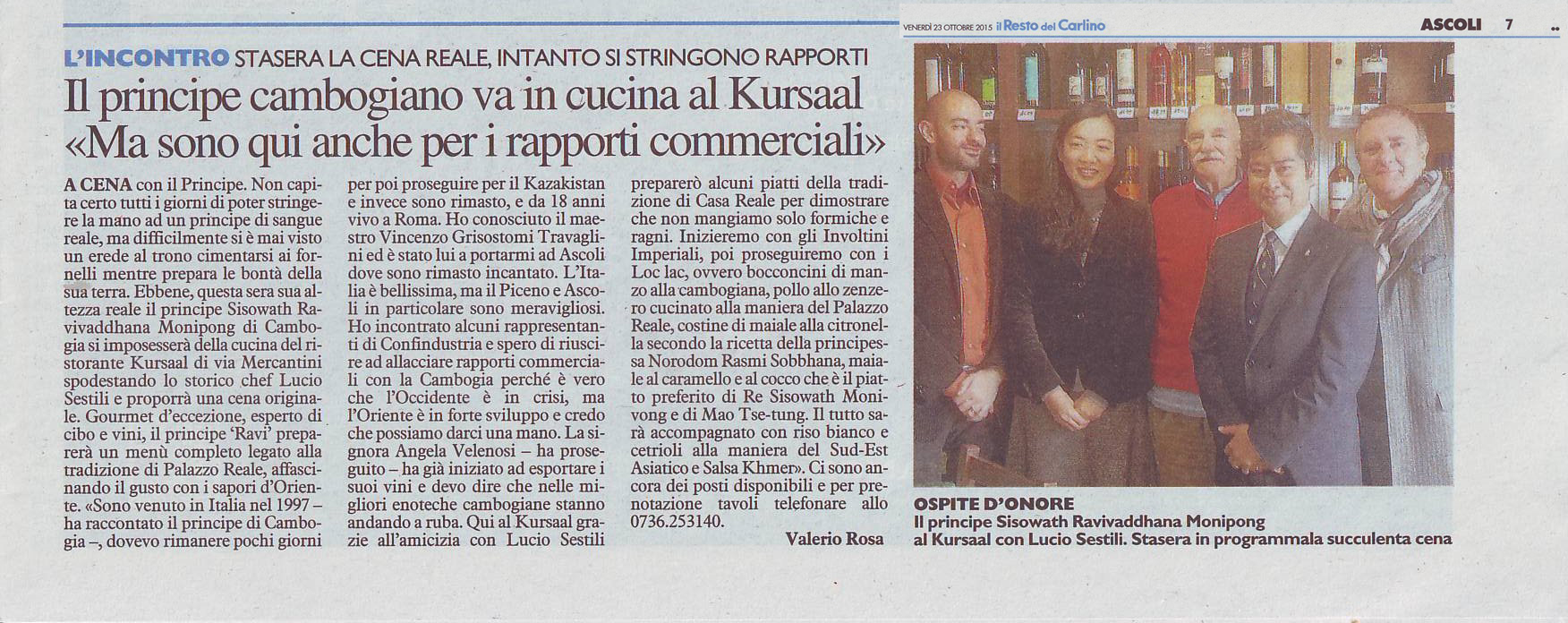 Vorrei ringraziare calorosamente tutti i miei amici del Kursaal per la loro gioiosa collaborazione, uno staff con il quale mi sono sentito in “famiglia”, cosī come nelle cucine del Palazzo e così come per lungo tempo in Francia, dove al limite del giardino della nostra casa era segnato il confine ideale tra un mondo esterno e la partecipazione e il calore delle nostre tradizioni più care. Musica, canto e cucina con i sapori di Cambogia, un’arte che abbiamo ieri sera condiviso nel segno della più genuina ospitalità Marchigiana. Sara e Simona, Riccardo e con loro la deliziosa, competente e petulante Rita, Monica in una sua rinnovata esperienza nella cucina asiatica, l’affascinante Grazia e la forza tranquilla e sempre sorridente di Philip. Cosa chiedere di più, caro Lucio, sempre attento e misericordioso nell’esaudire ogni desiderio… Ed il nostro desiderio, di Vincenzo e mio, è di ritrovarci presto insieme, nella “generosa” Famiglia del Kursaal, con immutato affetto. Magari, perché no … allietati dalla promessa di una succulenta anatra in umido e buon vino.