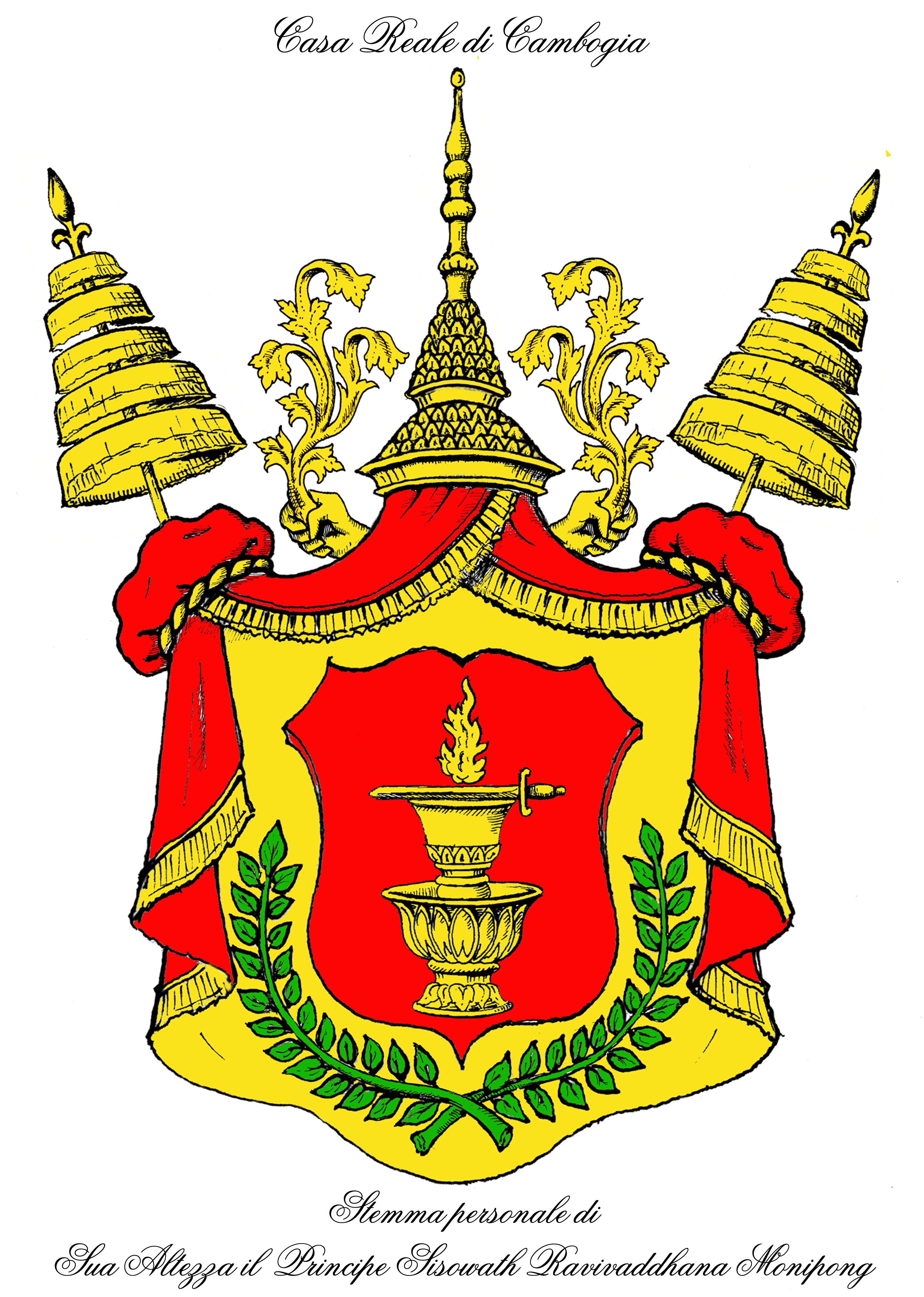 Ornamenti esteriori: dalla corona muove un manto dorato, gallonato d’oro, foderato di seta candida, con due ombrelli reali cerimoniali d’oro, ciascuno con cinque palchi, terminanti con una punta acuminata, decussati, accollati dietro lo scudo ed infilati nei nodi del manto: la corona è addestrata e sinistrata da due mani, moventi dai fianchi del cerchio più basso della corona, tenenti ciascuna una fronda vegetale contorta e rabescata in stile cambogiano, il tutto d’oro; lo scudo è accompagnato alla base da una corona formata da due rami di alloro verdi, decussati sotto la punta dello scudo.”